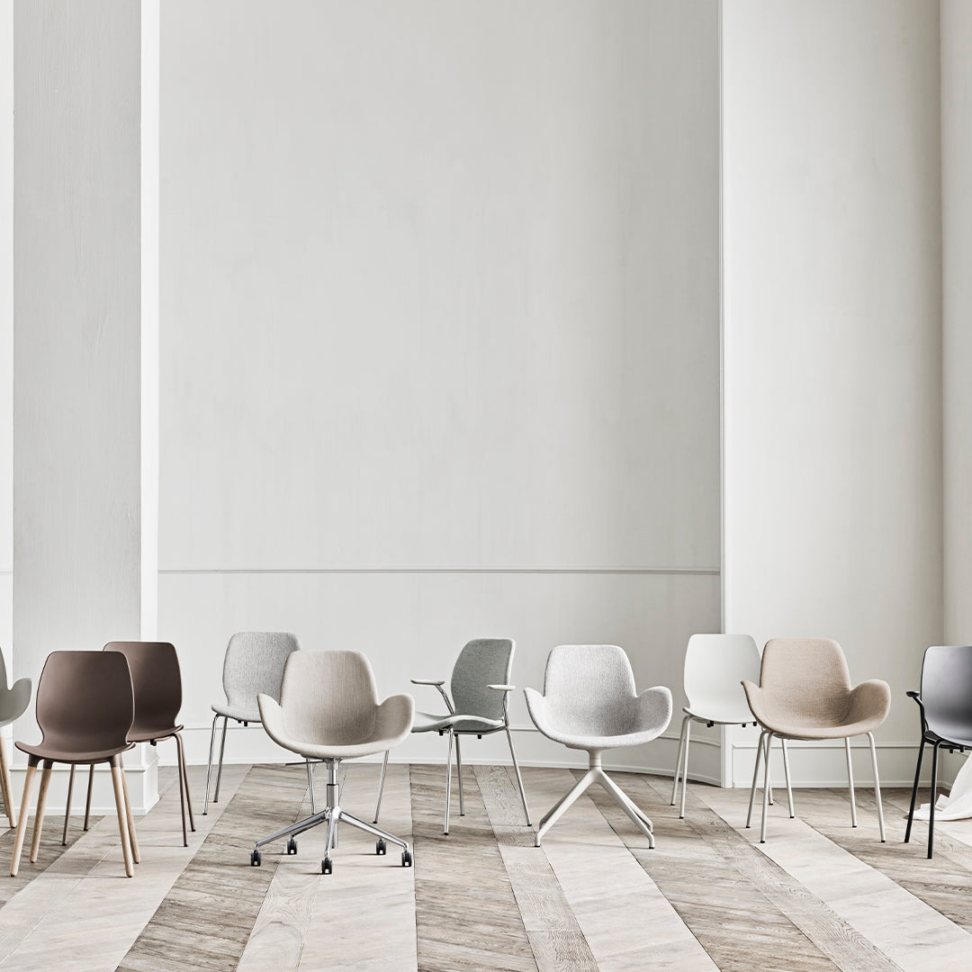 The Seed chairs are tailored to your needs and can be beautifully adapted to all settings – from home offices and dining rooms to professional markets. Made from 85% recycled plastic, the poetic shape is designed to embrace you with exceptional comfort and support. During the moulding process, where waste plastic is converted into the shape, it creates a subtle interplay of colors, which makes each individual shell completely unique. Choose the frame type that best suits your needs, or the upholstered version in your preferred upholstery fabric and color. The possibilities are endless.