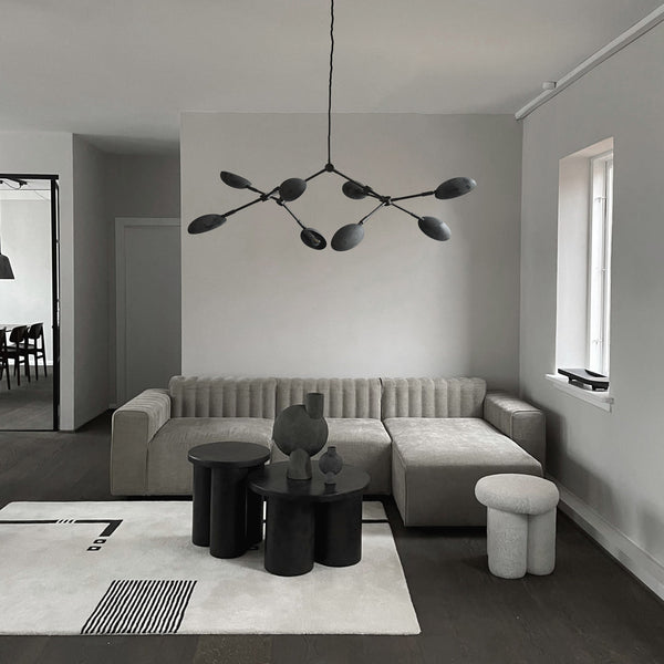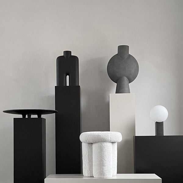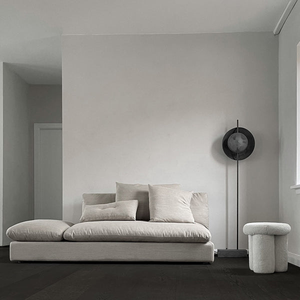 A quirky and contemporary addition to any interior setting and family alike, the Big Foot Stool is inviting and friendly in its sculptural, organic shape. Consisting of three circular legs and a soft, round seat, all surfaces are upholstered with natural sheepskin in a soothing off-white colour or in a chalk-colored cotton and linen fabric. Designed by Kristian Sofus Hansen & Tommy Hyldahl.