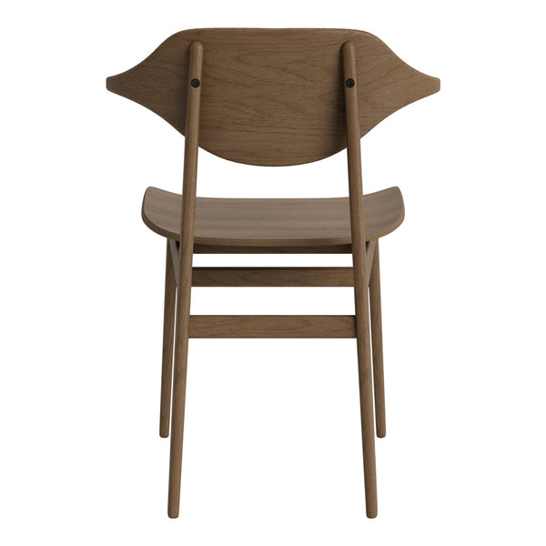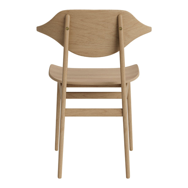 With rich wood grain, the Bufala Chair has a distinctive appearance to match its high-quality, solid-wood construction. The back is made with a special production technique pressing 36 layers of oak veneer in a compression mold, forming the characteristic buffalo horn shape that provides back and arm support.