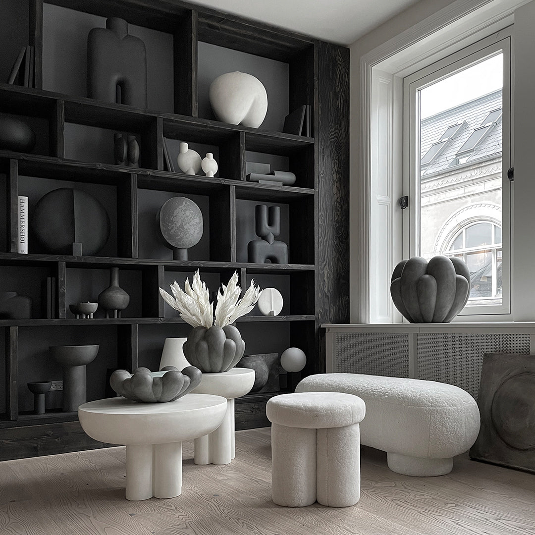 The collection of tables entitled Crown are cast in one piece formed as a circular table top carried by four cylinder shaped legs. Standing strong and proud, the table is inspired by the bare, structural elements of Brutalist architecture, celebrating the columns, and eluding an attitude towards too many details. The chunky fiber concrete legs enable a large gap between the table edge and legs to emphasize the experience of a massive floating table top. The table is available in two sizes and can be used as a single standing side table or stand together as a pair of coffee tables. Designed by Kristian Sofus Hansen; Tommy Hyldahl.