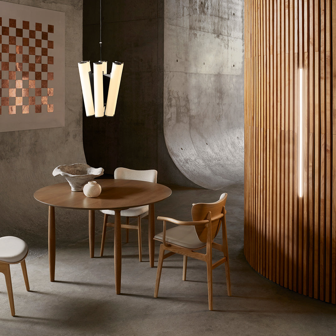 The Elephant Chair is a dining chair version of the popular Elephant Lounge Chair. To add even more comfort we are introducing an Elephant Chair with armrest. The armrest is made of bent oak and provides firm support. The design is a new and modern touch to traditional Scandinavian dining chairs and the armrest with its strong lines gives an interesting contrast to the soft shapes of the Elephant. The result is a chair that can stand stylish on its own as a side chair or in a set of many around a dining table.