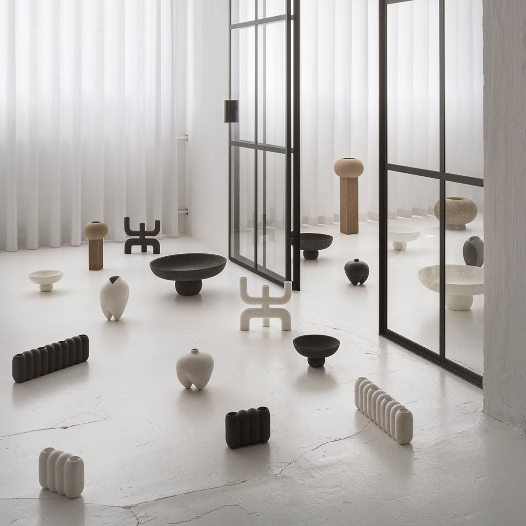 Rich on architectural references, the Empire Vases reminisces building facades to create a slim and vertical design. The riffled surface creates a tactile feeling and shadows changes the vase throughout the day. The height of the Empire Vases makes them ideal for tall flower decorations and long branches. The series is made of ceramic as it is a hand glazed natural product, the colours may vary slightly and while it is not 100% waterproof, a bag for fresh flowers is included. Designed by Kristian Sofus Hansen & Tommy Hyldahl.