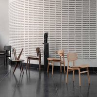 Fin comes with a table top of oak veneer with round edges, making it paper thin seen from one angle and solid from another. The table has two turned oak timber sections, contrasted by a fin-shaped leg of massive oak.