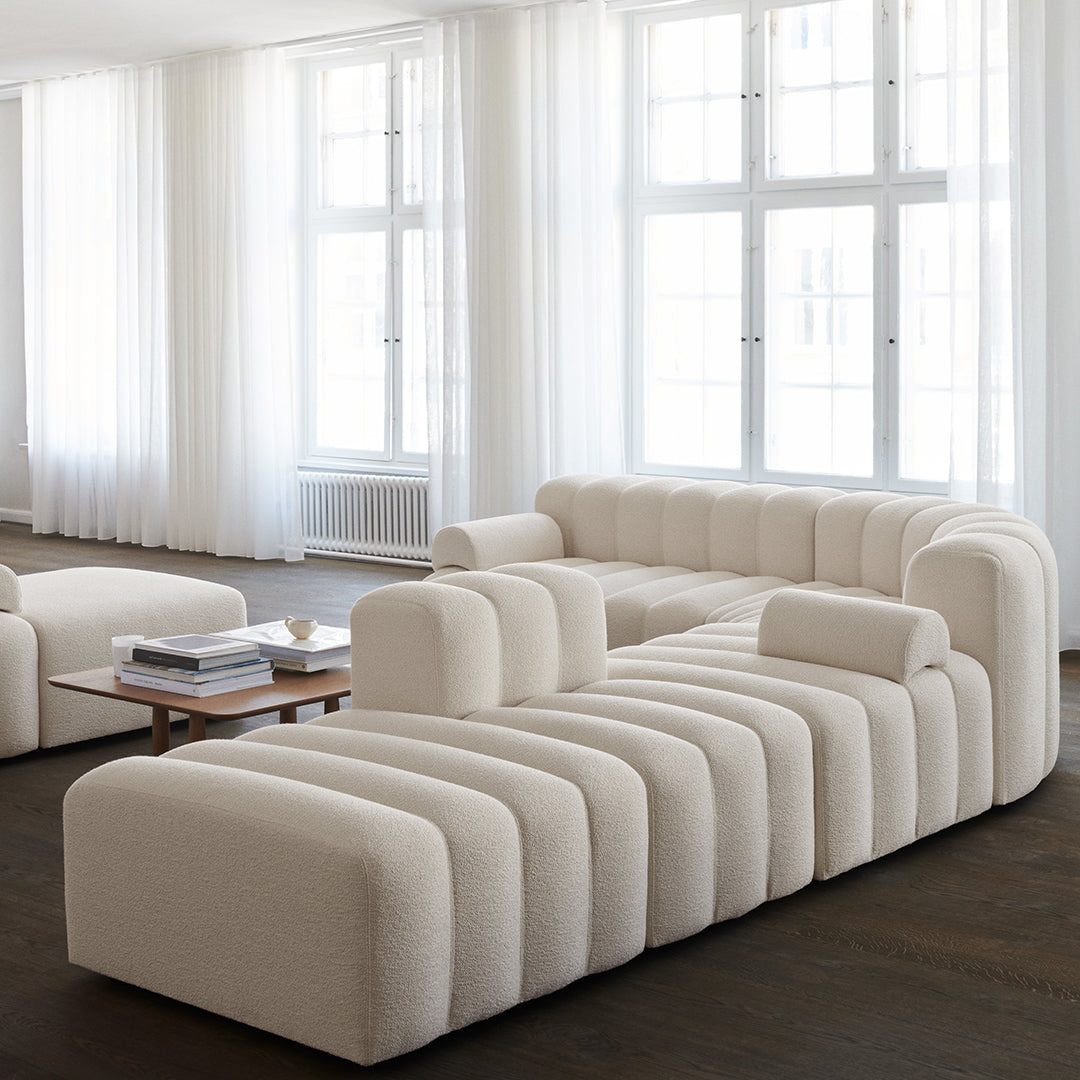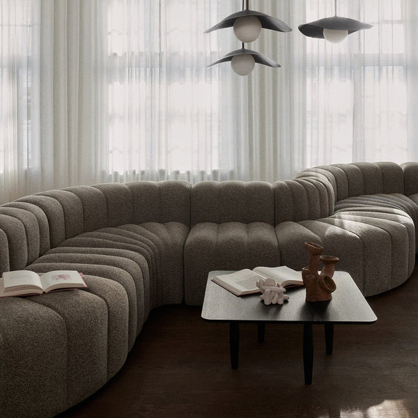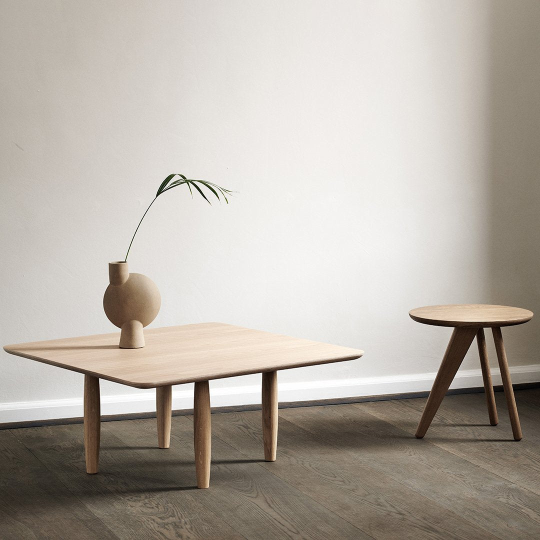 The Oku table top is produced in oak veneer with round edges, adding a refined detail to the large surface. The legs of turned oak timber sections, is positioned sporadically to create the illusion of a floating table top, while also adding a sculptural detail to the table.