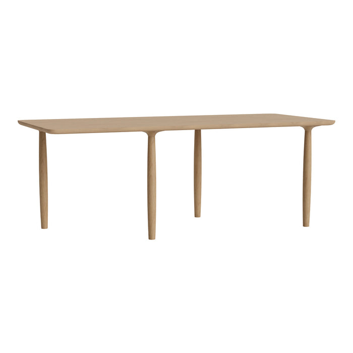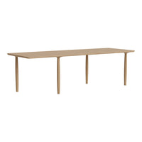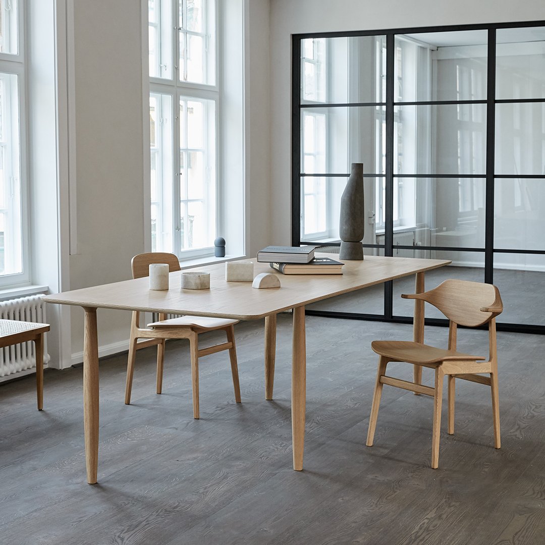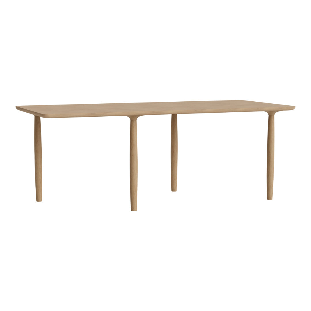 The Oku table top is produced in oak veneer with round edges, adding a refined detail to the large surface. The legs of turned oak timber sections, is positioned sporadically to create the illusion of a floating table top, while also adding a sculptural detail to the table.