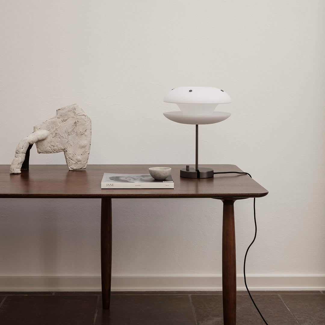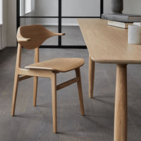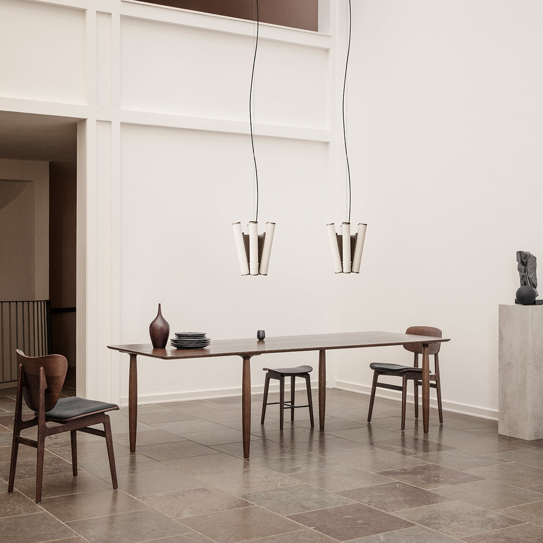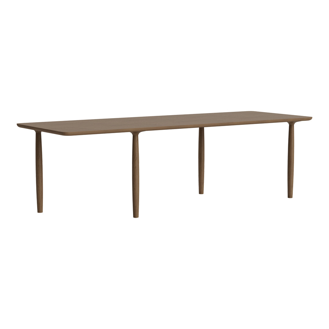 The Oku table top is produced in oak veneer with round edges, adding a refined detail to the large surface. The legs of turned oak timber sections, is positioned sporadically to create the illusion of a floating table top, while also adding a sculptural detail to the table.