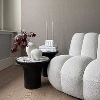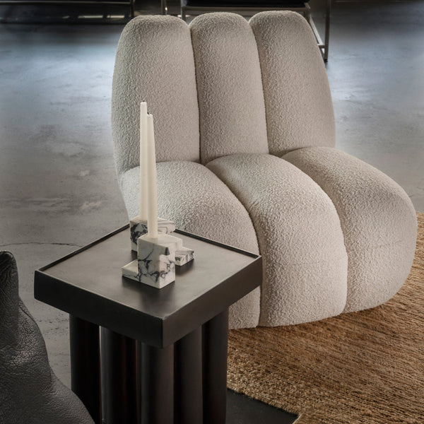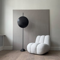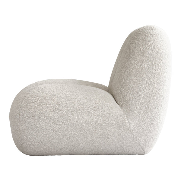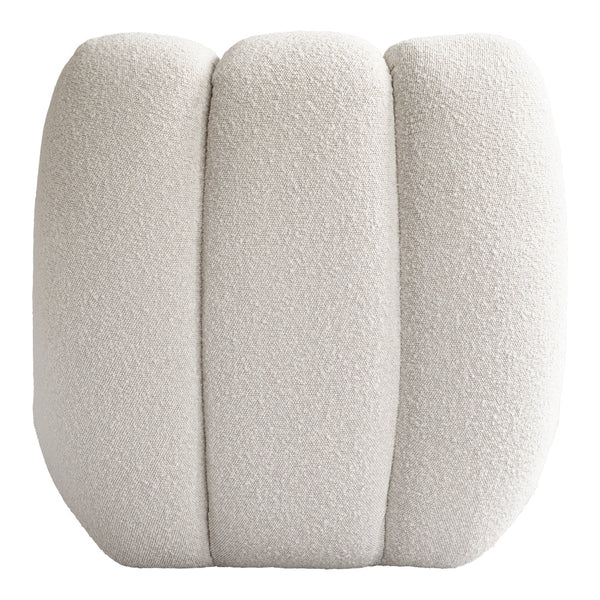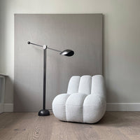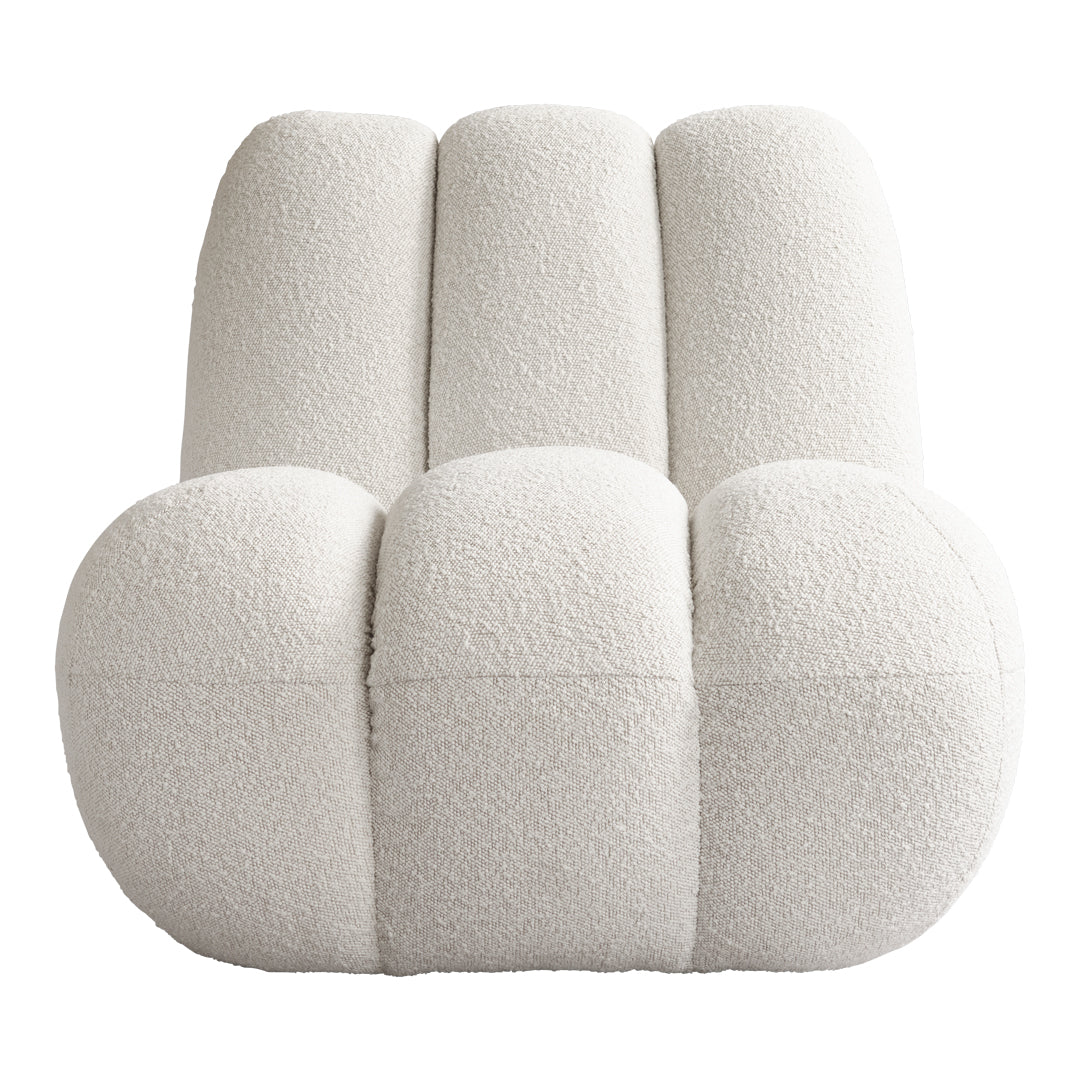 A Tribute to 70s futuristic design and space age, Toe is a lounge chair with expressive aesthetics and high seating comfort. Characterised by a sculptural approach to furniture design, the Toe Chair has a thick fluted upholstery running from seat to back, creating a linear and voluminous shape. The open chair form gives a free and easy seating experience, while the special combination of different kinds of foam ensures an overall high seating comfort. Toe Chair comes in off-white bouclé fabric. Designed by Kristian Sofus Hansen; Tommy Hyldahl.