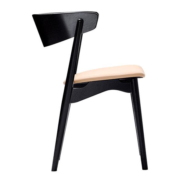 The characteristic moulded backrest is a defining element that not only lends the chair its bold personality but also ensures outstanding seating comfort. The gently tapered back legs give the design a light and elegant appearance. Likewise, the seat construction lifts the seat free of the legs, contributing to the clean and simple expression. An original dining chair of enduring beauty and quality.
