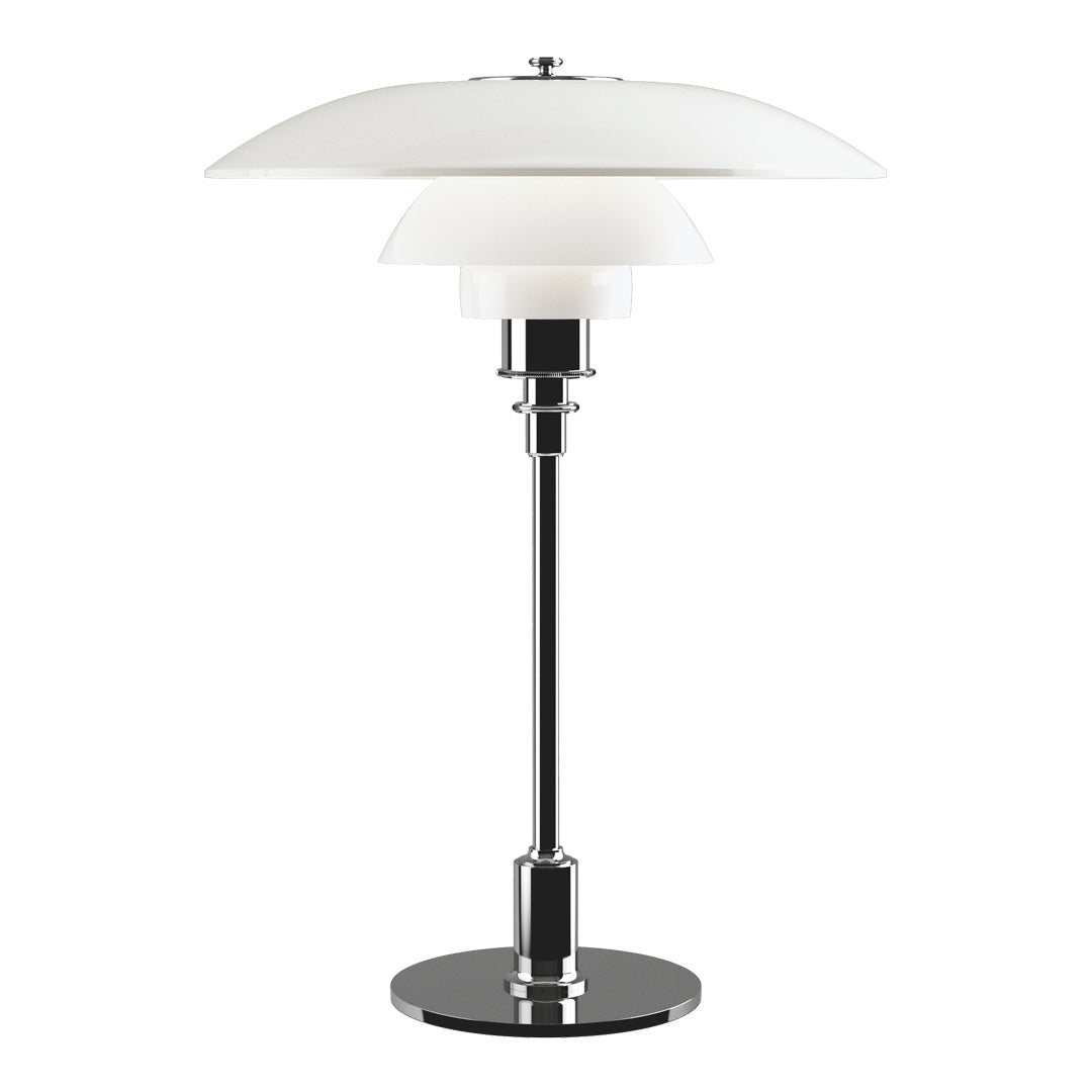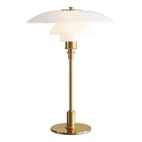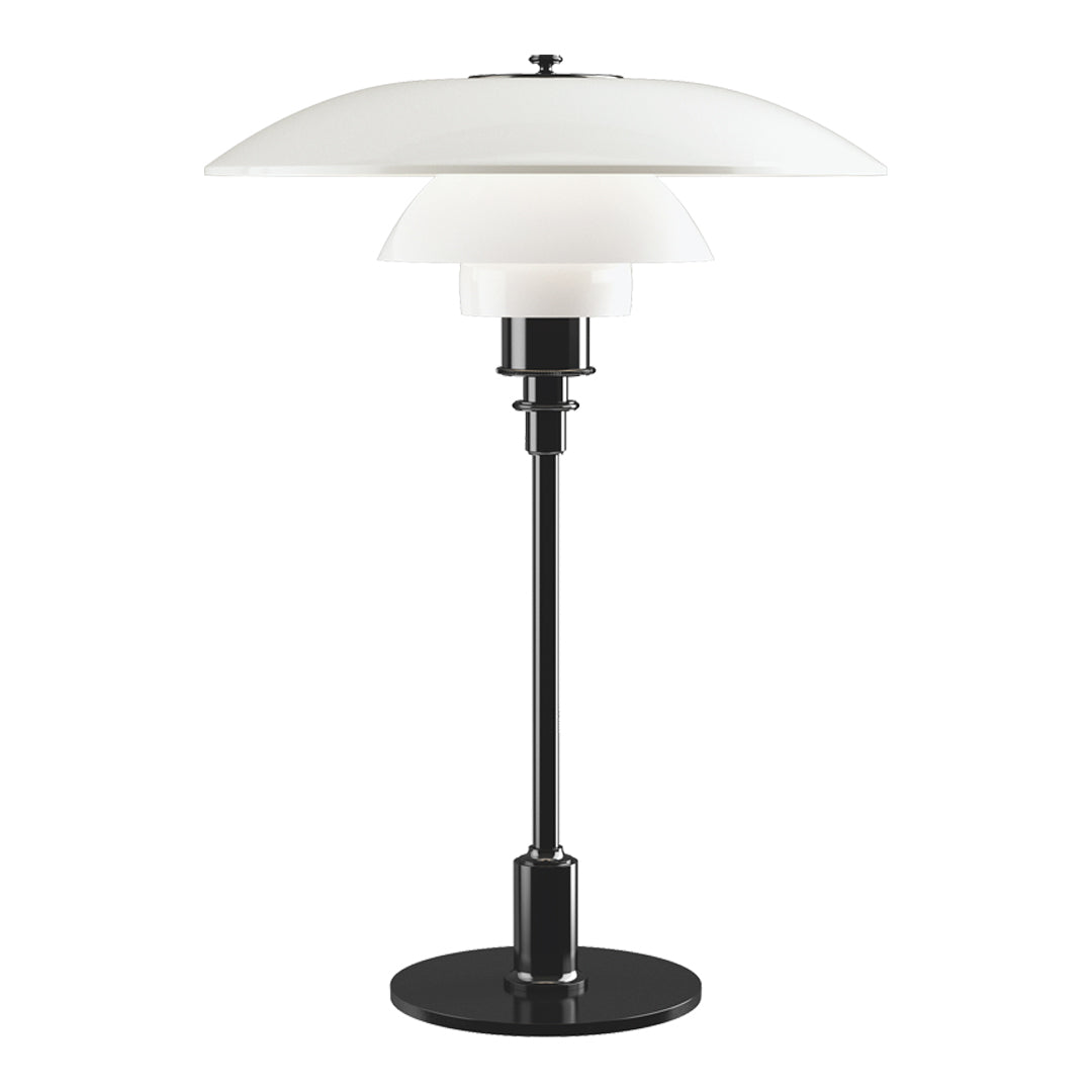 The PH 3 ½-2 ½ Glass Table lamp was designed in 1928 and is one of many advanced projects undertaken by Poul Henningsen in the development of his world-famous three-shade system from 1926. Poul Henningsen devoted most of his life to taming electric light. He based his three-shade design on a logarithmic spiral to make optimum use of the light source. He was constantly doing calculations and tests. The form of the shades was determined by the way they were required to shape and reflect the light, and the lamp was designed to be glare-free. The first PH Table lamp was completed in early 1927 and launched as an alternative to low-pitched hanging lamps. The white opal glass shades soften the overall look of the lamp and illuminate its surroundings with a perfect, harmonious and glare-free light that only the classic three-shade system is capable of emitting. The shades are mouth-blown three-layer opal glass, which is glossy on top and sandblasted matt underneath to provide soft and uniform light distribution.