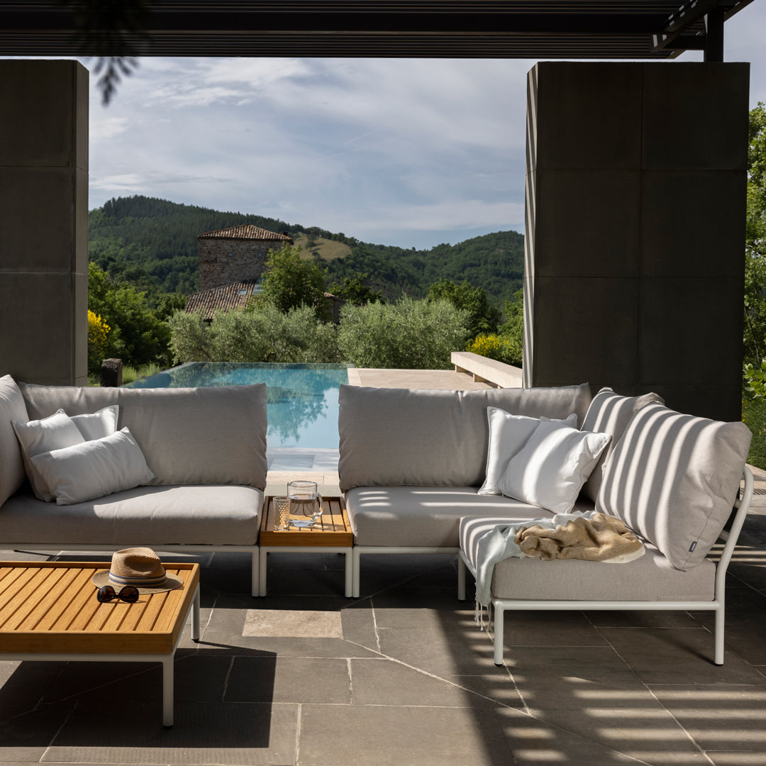 It's all about level, to come eye to eye with nature, to relate to the horizon and to get lines and shapes to move up to a higher level! The lightweight frame and soft cushions creates both contrast and comfort - and lures with relaxed lounge atmosphere. LEVEL is a lounge series consisting of 2 sofa modules - one left and one right - a single chair, an ottoman, a coffee table and a side table, which makes it possible to mix the modules in many different ways.