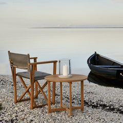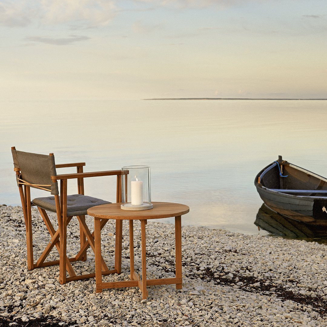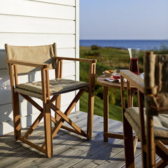 A chair in teak and fabric fitted to the backrest with leather. Matching cushions are is included. The Kryss table is also in teak. Originally designed for a roof terrace on the Swedish Embassy in Cairo in 1975. The canvas fabric edition is for indoor use only.