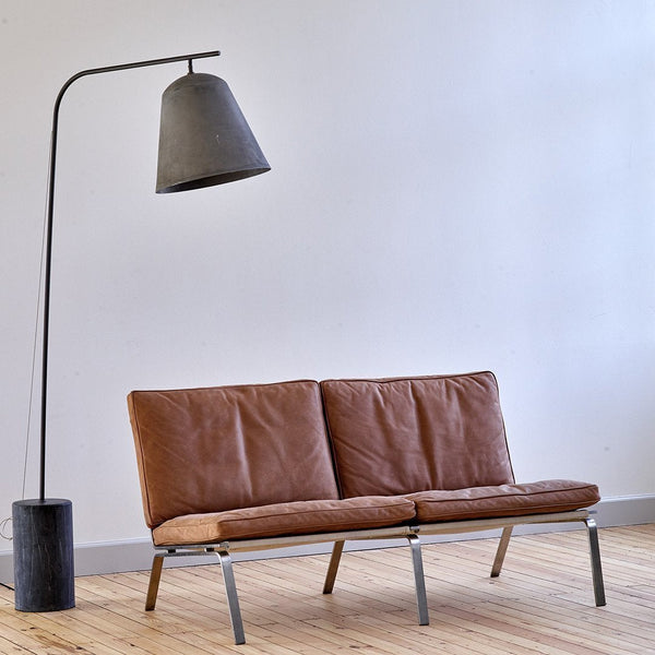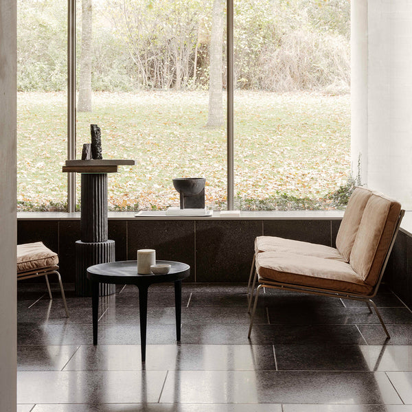 The series consists of two- and three-seater sofas, lounge chair, daybed, chaise longue, coffee table and side table. The leather cushions come upholstered with various types of Premium or Vintage hides from Sorensen Leathers and the tables come with a fine black marble from the Iberian peninsula or a veiny green Indian marble.