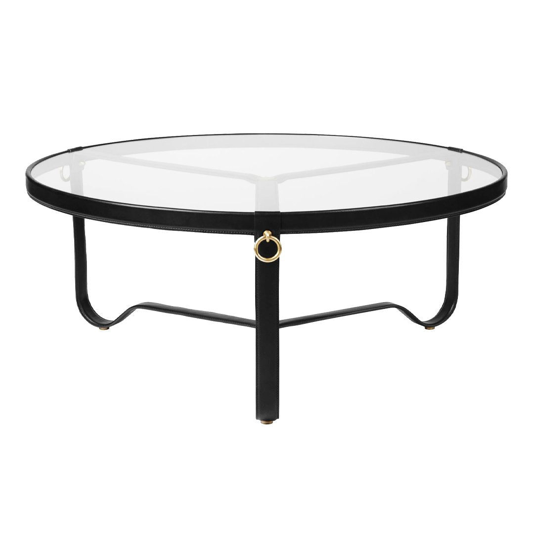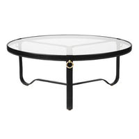 Placed on three soft curved metal legs, elegantly meeting in the heart of the table, the round glass top is edged with a hand-made leather rim and adorned with three gilded brass rings. The timeless design of the Adnet Coffee Table embodies modern materials and superb craftsmanship and adds a distinctive value to any home or professional space.