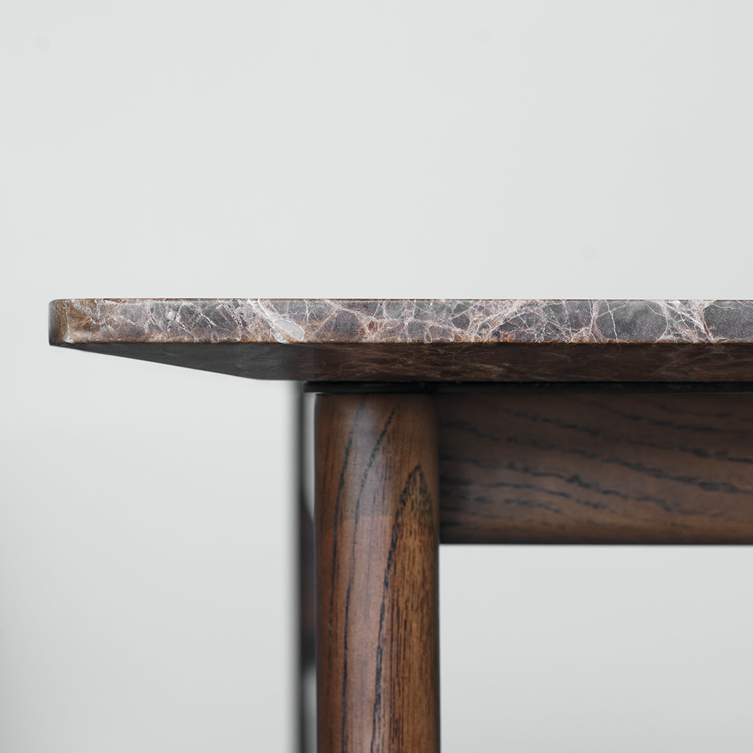 The material composition creates a compelling sensory dialogue between elements. The tabletop in rich brown Emperador marble introduces organic patterning and tactile luxury, while the FSC-certified solid oak and veneer base grounds the piece with natural warmth. The visible wood grain and meticulous staining process highlight Wendelbo's commitment to craftsmanship and material integrity. This thoughtful pairing creates a sophisticated table that complements both contemporary and transitional interiors with equal refinement.