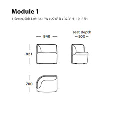 Module 1 (1-Seater, Side Left): 33.1" W x 27.6" D x 32.3" H | 19.1" SH