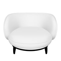 The chair's defining characteristic is its sweeping, sculptural backrest that flows seamlessly into a round, generously proportioned seat, creating an embracing form that invites lingering comfort. Pronounced piping details trace these organic contours, adding both visual definition and tailored refinement that showcases Wendelbo's exceptional upholstery craftsmanship.