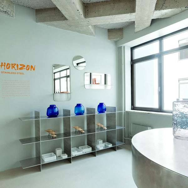 Horizon is a collection of wall mirrors in varying geometric shapes that all have a steel shelf integrated into the design. The shelf serves as a practical place to put things on, at the same time creating a beautiful visual effect. The Horizon wall mirrors are the perfect hybrid between functionality and aesthetics.