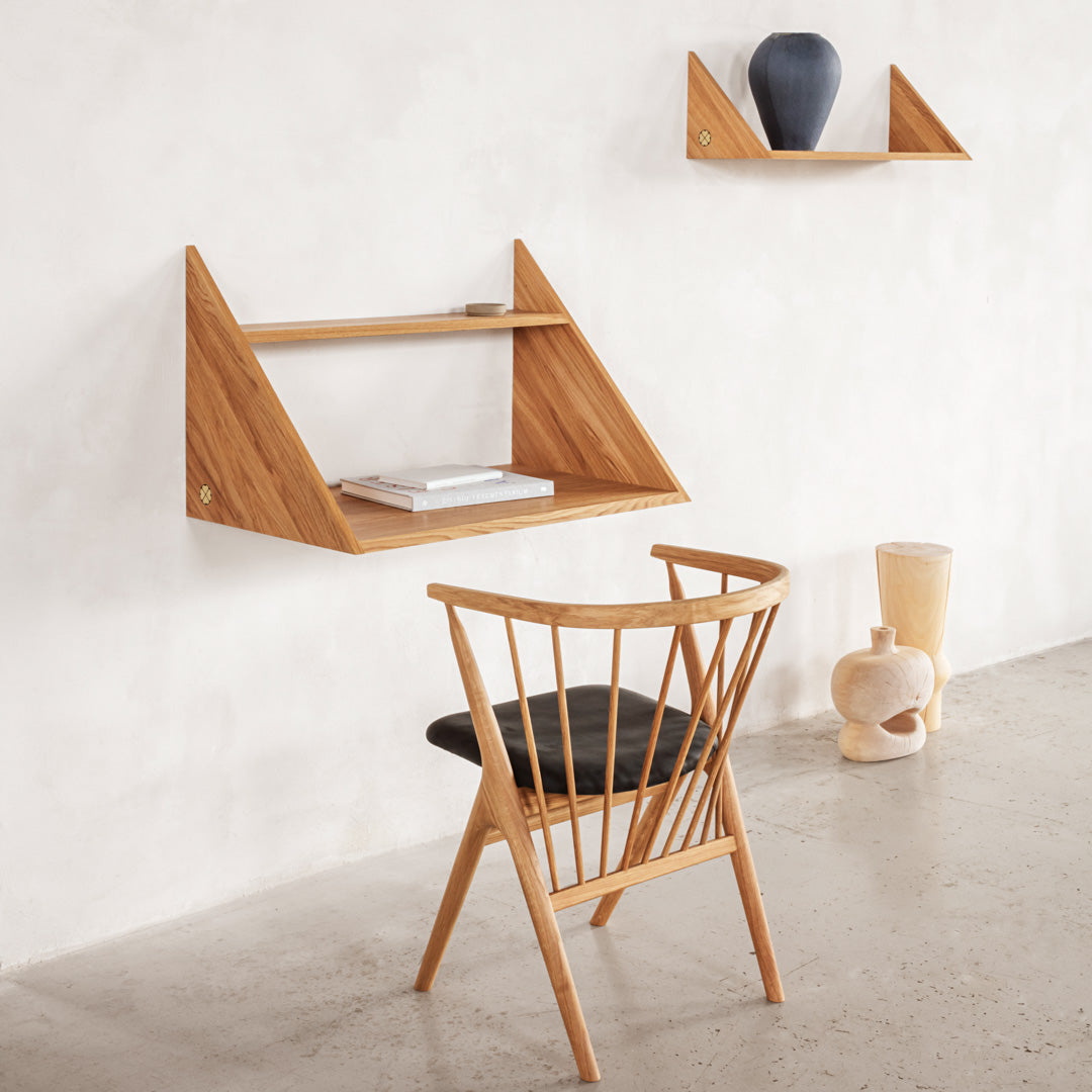 Sibast Furniture worked with danish artist Kasper Eistrup in developing the XLIBRIS series. Despite its apparent simplicity, XLIBRIS is brimming with small artisanal and functional details. These include a concealed cable outlet in the wall-mounted desk, enabling the elegant and discreet connection of a laptop, smartphone or lamp to the power grid. Both the shelf and the wall-mounted desk are assembled without visible screws, emphasising the impression of XLIBRIS as two integrated pieces of furniture that seemingly grow out of the wall. Kasper Eistrup’s artistic approach to design and his sense of detail are also evident in XLIBRIS, furnished with an exclusive brass emblem mounted on the side of both the shelf and the wall-mounted desk. The emblem is made up of four hearts joined into a four-leaf clover. The hearts symbolise a predilection for necessity, functionality, the material and the craft – all of which were involved in the development of XLIBRIS.
