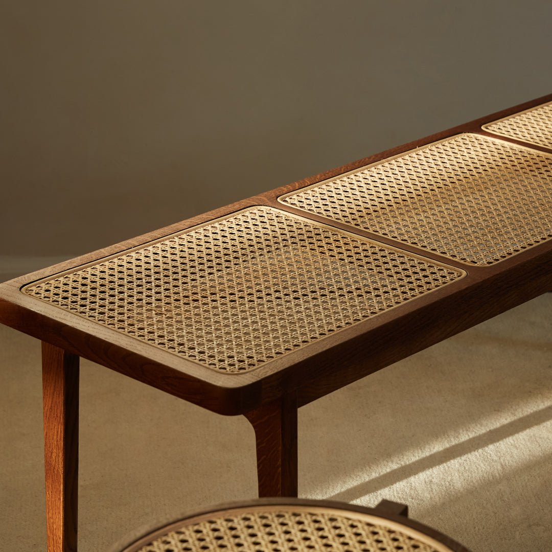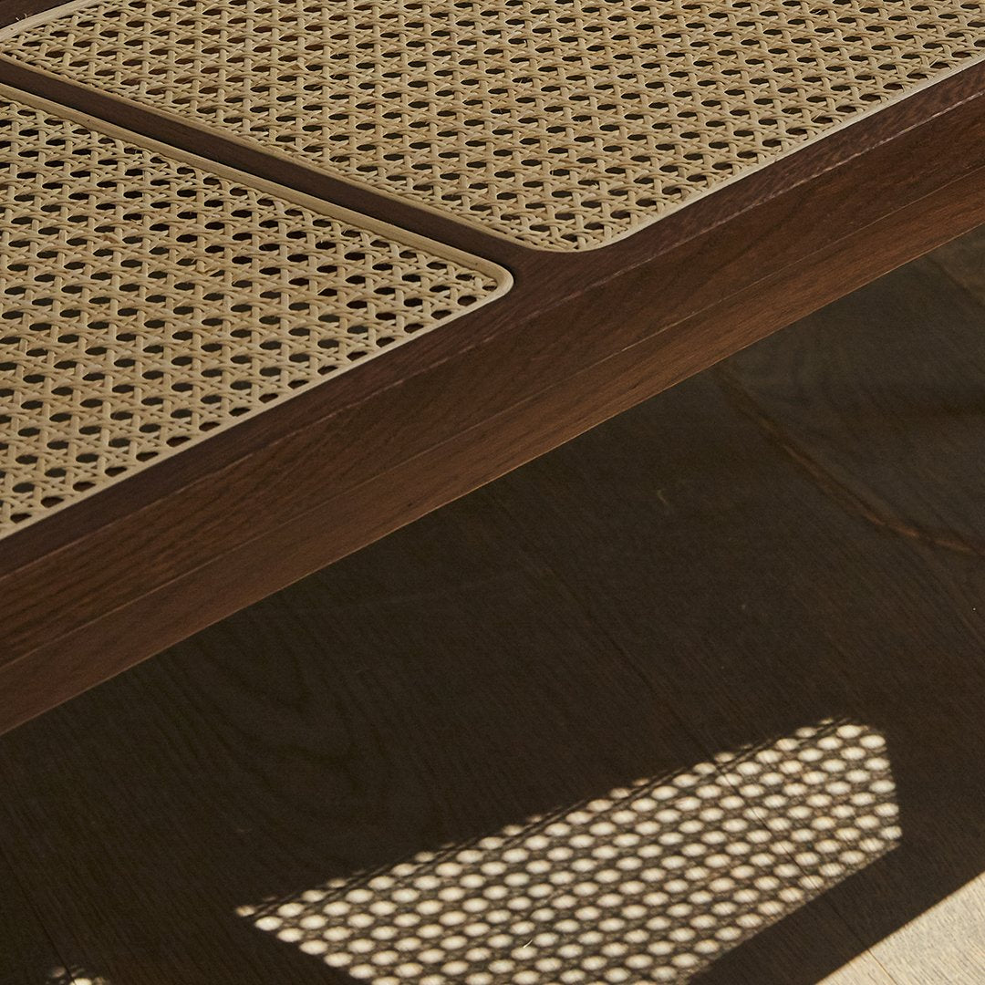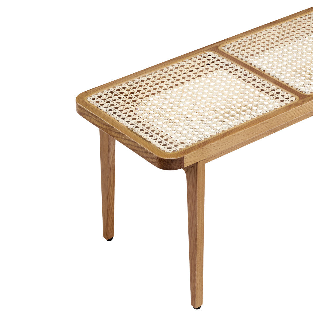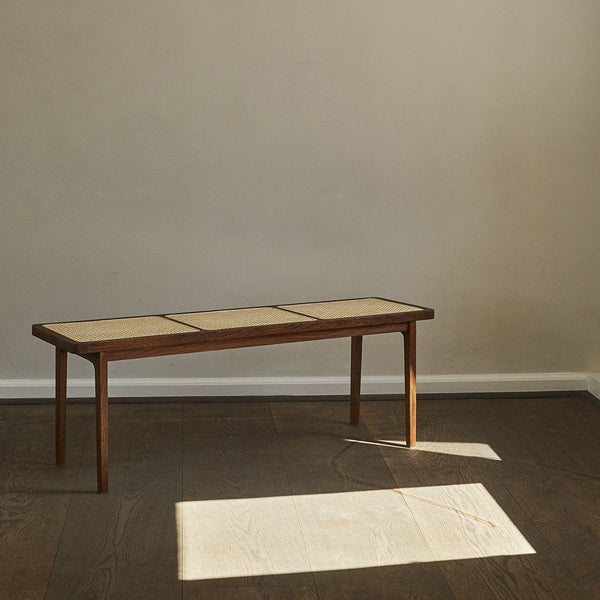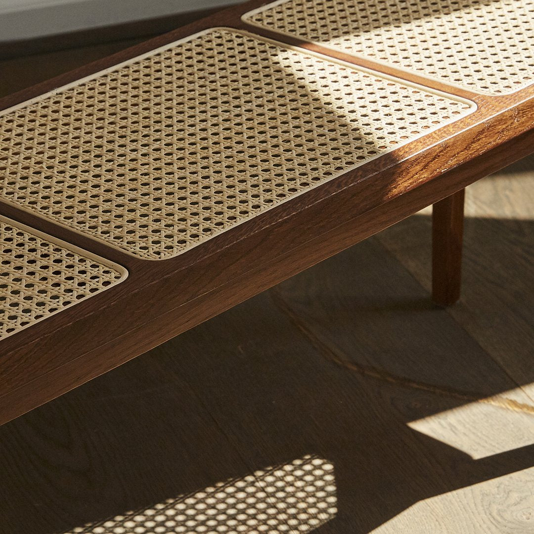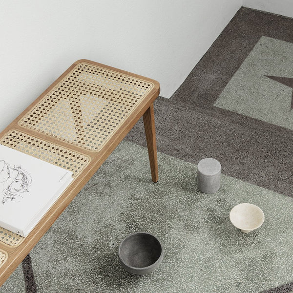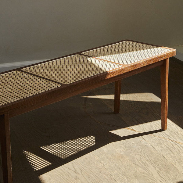 The Le Roi is a bench made from solid oak with inlaid French rattan mesh. Le Roi is the French word for King, and the series is a minimalistic interpretation of rattan furniture from the French colonial time, merged with well known Scandinavian furniture archetypes, such as the three-leg circle table and the rectangular bench.