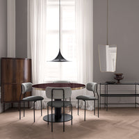 The Semi Pendant is a unique pendant lamp, based on two quarter-circles put together, back-to-back. It's distinctive arch-shaped, enamelled metal shade creates a diffused, cone-shaped light, ideal over a dining table or kitchen work surface. With its lightness of form, unique timeless design and range of colours and sizes, the Semi Pendant is extremely versatile and well suited to both private and public spaces.
