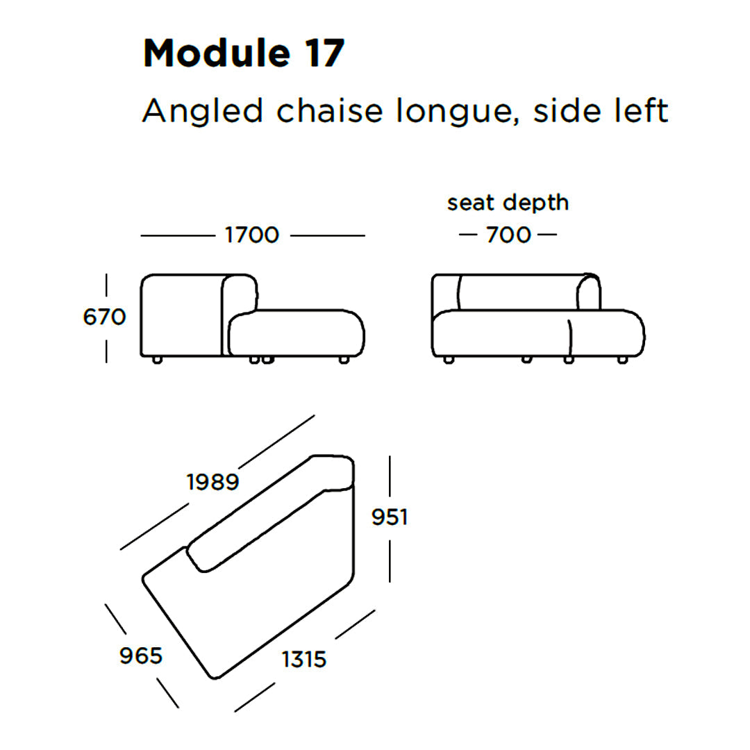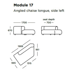 Module 17 (Angled Chaise Lounge - Side Left): 66.9" W x 78.3" D x 26.4" H