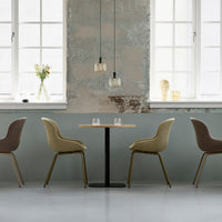 The Form Café Table has a centered steel base and linoleum or wood tabletops to complete the Form series’ versatile table selection. Choose between six linoleum colors or black, dark or light wood.