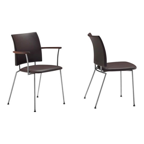 Panther chair in stainless steel with an upholstered seat and back for optimal support and comfort. Available with or without armrests in solid wood. The back of the chair is offered with upholstery in fabric, leather or with mesh.