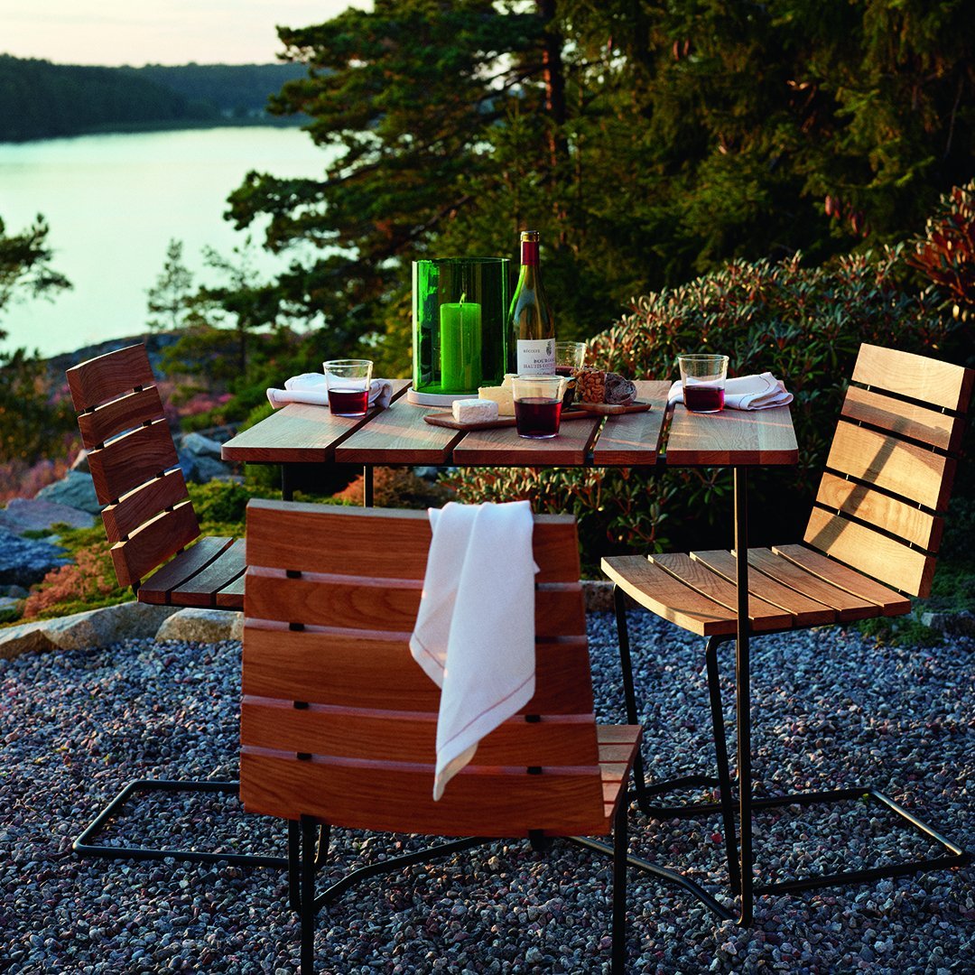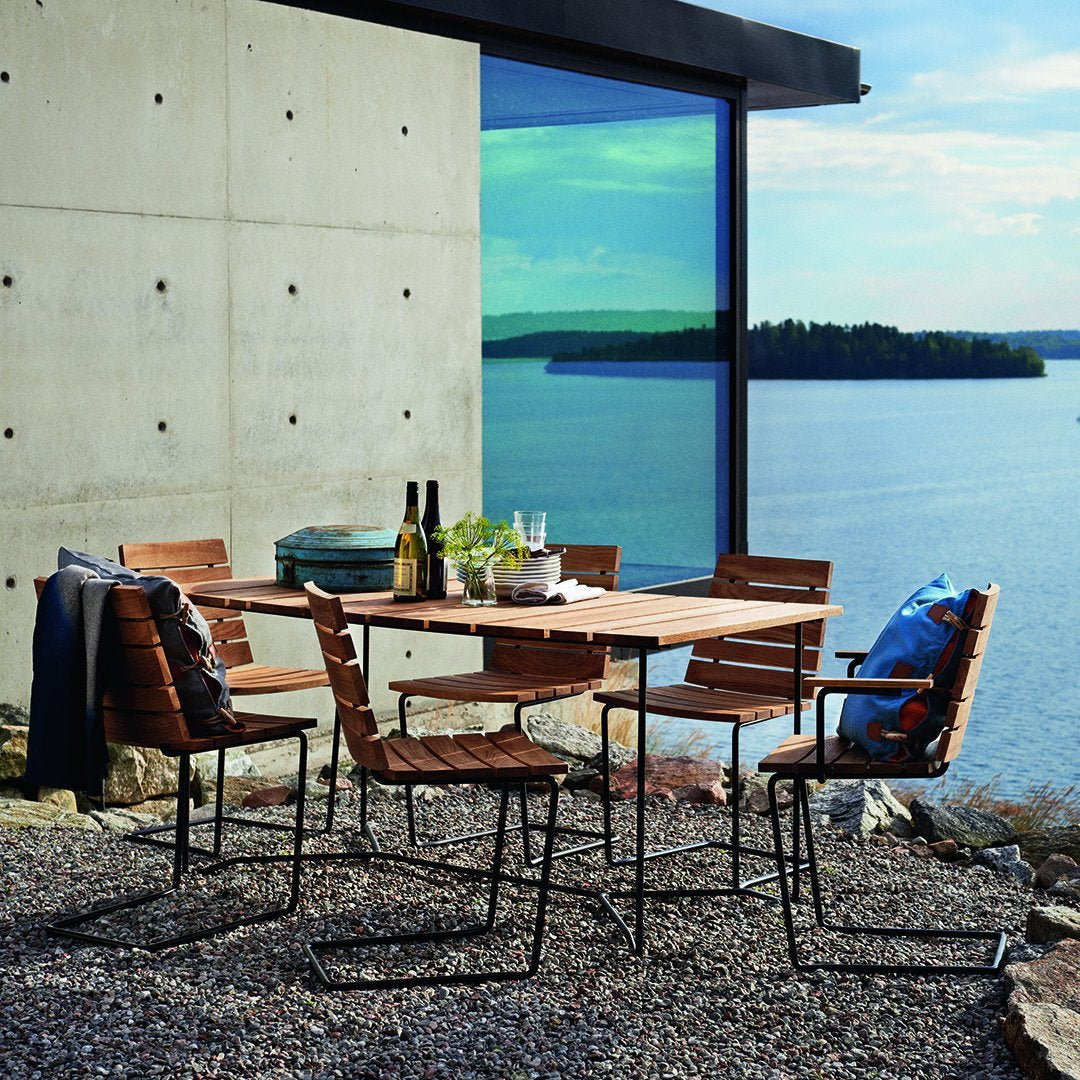 Grinda dining furniture comes in teak with a black painted steel frame. Grinda dining furniture includes a side chair, armchair, a bench, and four different sizes of tables to decorate your balcony, veranda, deck, lawn or wherever you host your dinner parties.