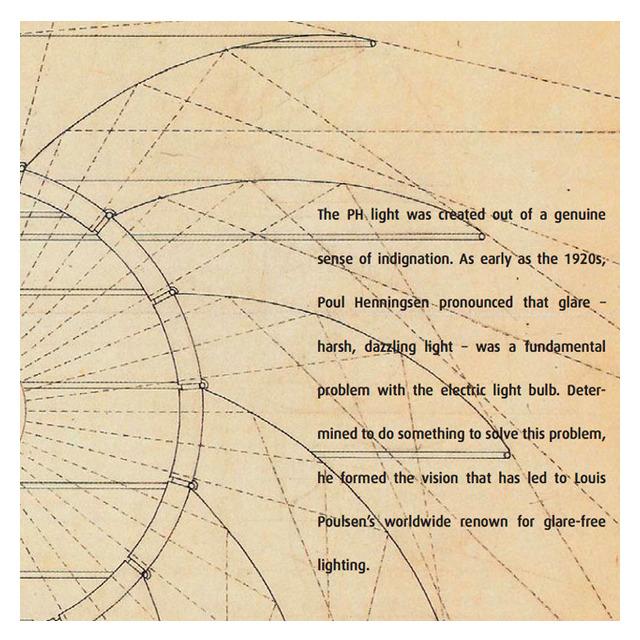 Poul Henningsen designd the three-shade system during 1925/1926. The first lights using the system were designed for an exhibition in Paris. His work with Louis Poulsen continued until his death in 1967. Throughout his life, PH sought to create glare-free lighting; aiming to direct light where it was most needed, and creating soft shadows while using incandescent bulbs as a light source. PH 4/3 Table is a member of the three-shade family. Approximately one thousand different models have been produced over the years and consisted of table, floor and wall lamps, as well as a number of different chandeliers, which were popular in the 30s for lighting private homes with high ceilings. There were countless combination options. The lights were available in different colors, as well as a range of sizes. The first shades were made of metal with a painted undersurface, such as white, gold or silver depending on whether diffuse, warm or cold light was desired. Glass was later introduced for the three-shade system. In addition to the downward-directed light, glass lamps illuminated the room. PH was the first person to pursue a scientific approach to light and use the logarithmic spiral as a basis. By using a design based on the logarithmic spiral he achieved even distribution of light over the entire curve of the shade. This even light distribution, together with the diffuse reflection through the glass, made it possible to control glare and shadow. Each shade reduces the amount of light equally, due to their distance from the light source. The PH light model numbers refer to the shade size. Each top shade had a corresponding set of middle and lower shades. In the pure models, such as the 2/2, the top shade has a size of about 20 cm, with corresponding lower shades. PH 4/3 Table consists of an approximately 40 cm top shade, but uses lower shades from the 3/3 model. These hybrid models were introduced due to the desire to hang pendants at lower heights. The system was also used for wall, table and floor lamps. PH 4/3 Table in its current form was introduced in 1966.