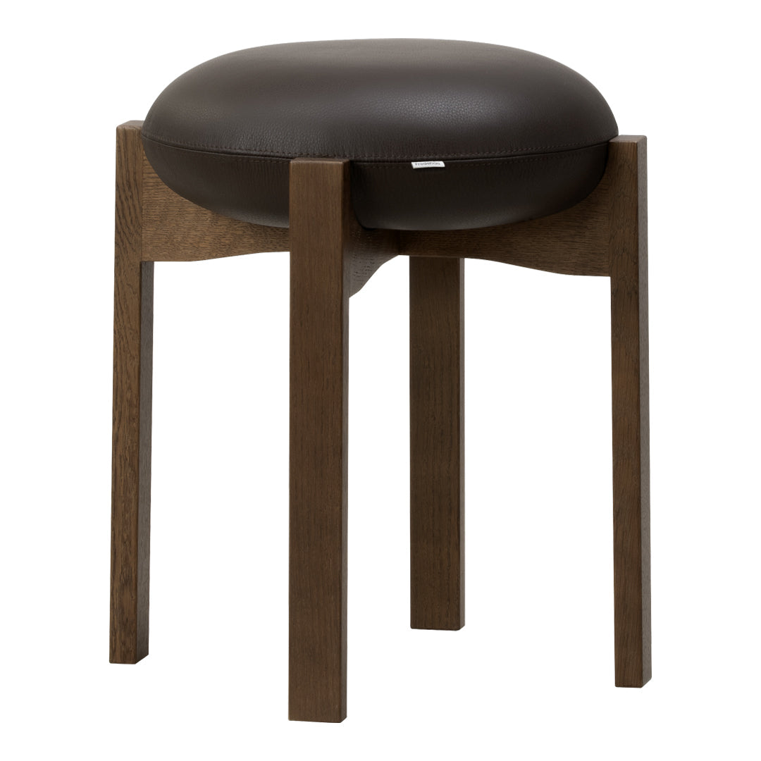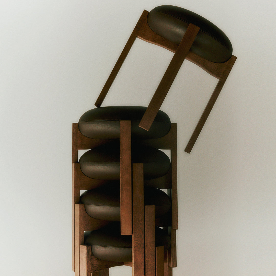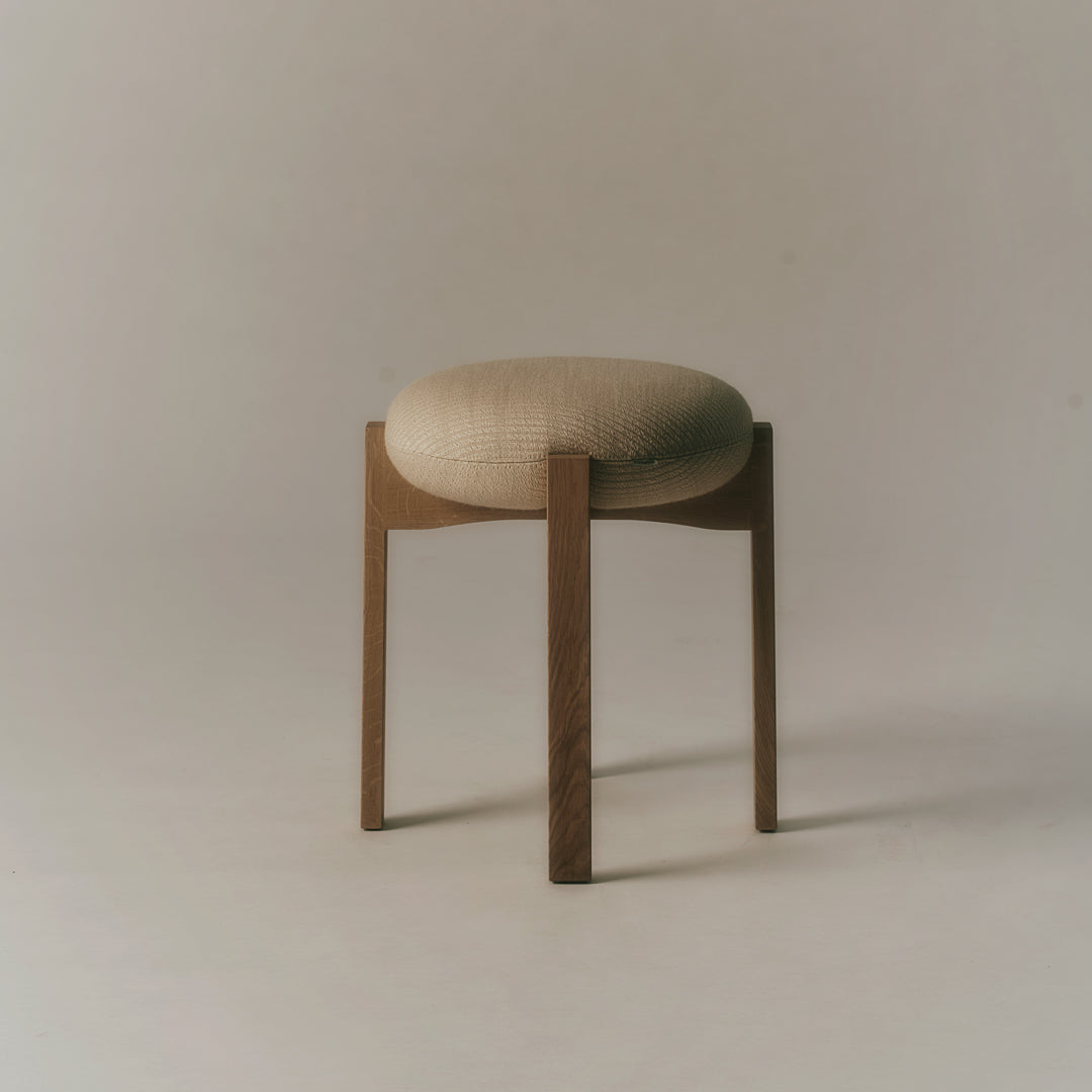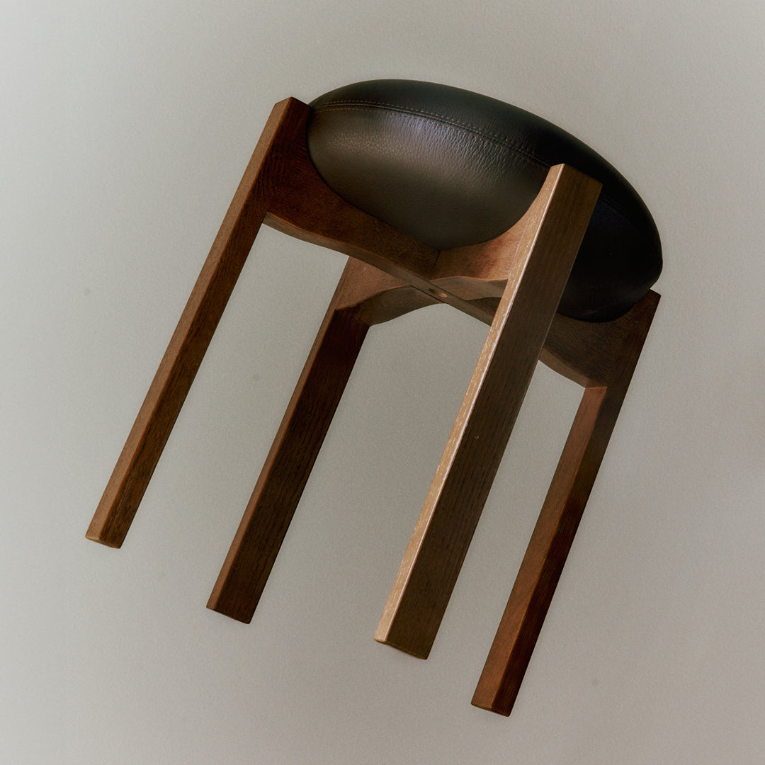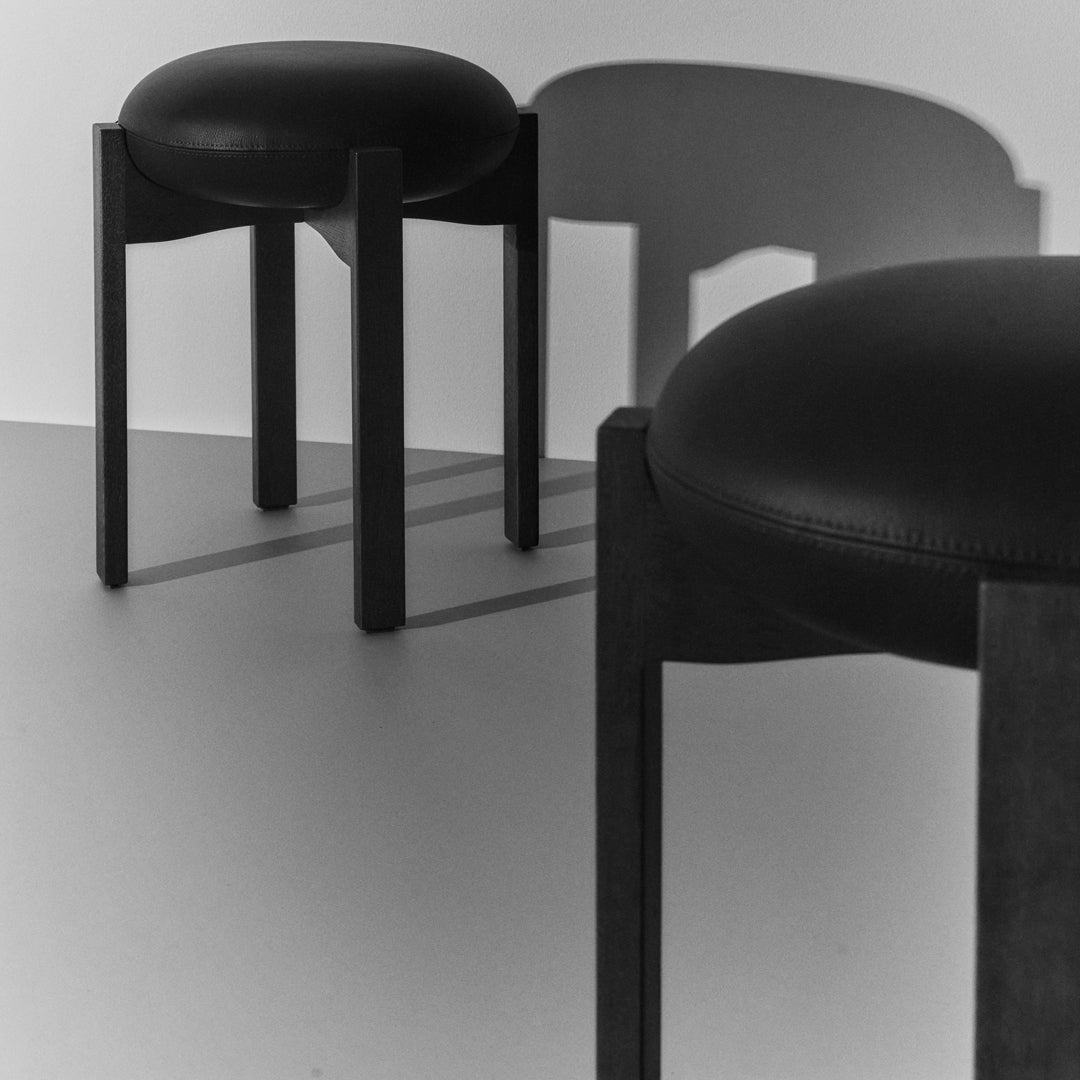 The chair’s simple, unique and distinctive combination of shapes and materials is a modern take on Scandinavian design that combines functionality with Bruun’s recognisable sculptural minimalism. The four vertical legs of the wooden frame are united in a cross composition with elegant indentations, where the light, the upholstered seat cushion, is placed on top. In contrast, the detailed indentation on the underside completes the overall artistic impression.