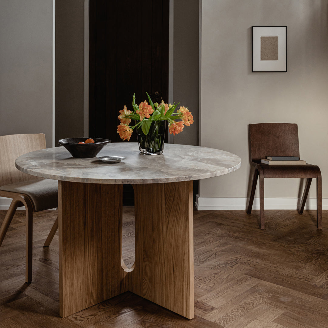 Available in natural or red-stained oak with a water based lacquered finish and offered with or without and upholstered seat or front, the pared-back dining chair showcases precise craft and natural materials to functionally beautiful effect. As an added feature, the upholstery can easily be changed by loosening four screws.