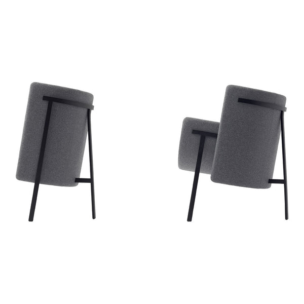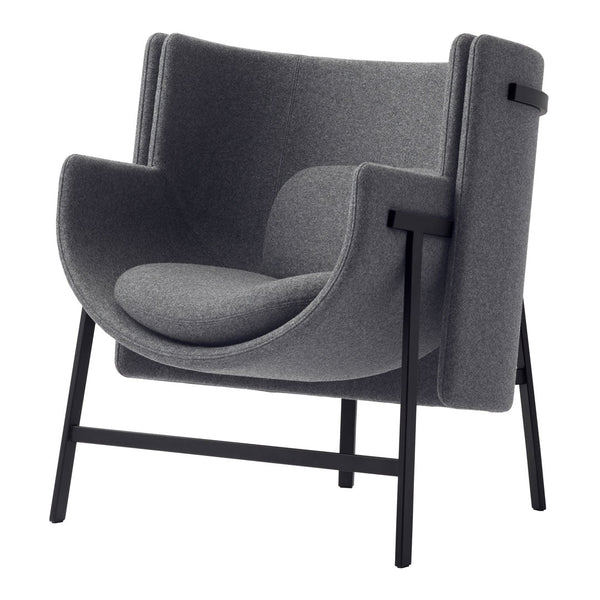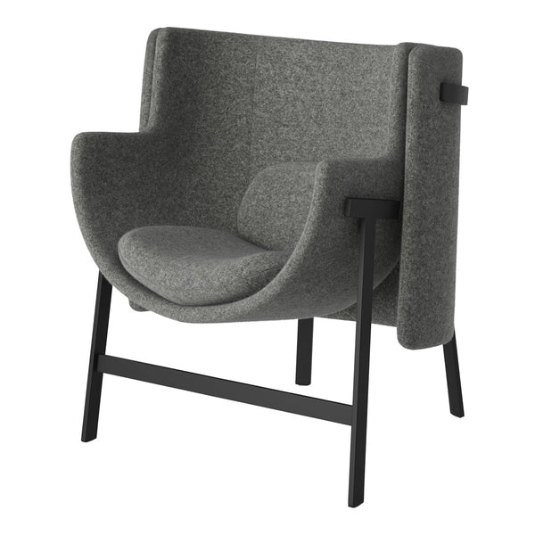 An armchair designed for common spaces in offices and hotels. There are numerous armchairs and sofas for lobbies and lounges, but those for narrow spaces such as corridors, elevator lobbies, and entrances are difficult to find. Therefore, a compact chair was devised to fit in those niches, for passersby to rest in for a spell or in which to have casual conversation. Attempts to make an armchair small normally leads one to think of gradual elimination of the backrest to create a bench-like furniture piece. But casting the backrest as the star to which the seat is adjoined yields a design less about sitting and more about leaning against a grand backrest. Such a design takes up minimal space while offering to the chair’s occupant a bit of calm and security. The backrest and seat are independent parts, with shallow and deep seats and lower and taller backs available for use in combination according to the size of the space and degree of privacy desired.