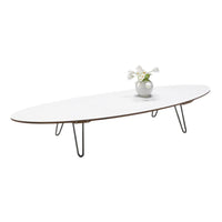 An elegant design with soft corners and clean lines. Featuring a unique combination of wood and Corian or solid wood, with stainless steel hairpin curved legs.