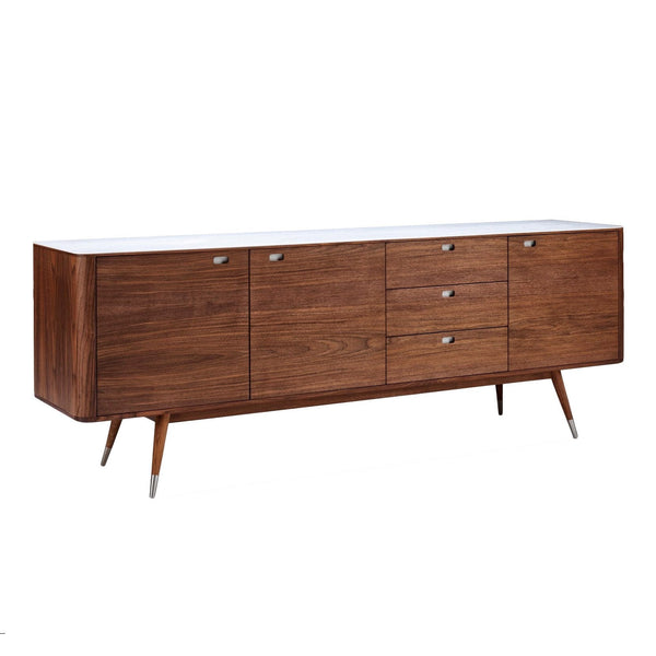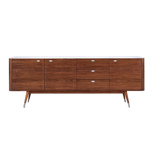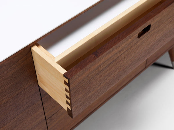 Sideboard with practical white Corian top where it is possible to serve food directly on the sideboard and put out drinks glasses without worrying about stains. Corian is inserted in the wooden handles. An easy and stylish Naver Collection sideboard.
