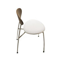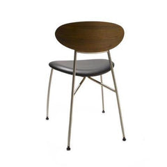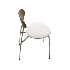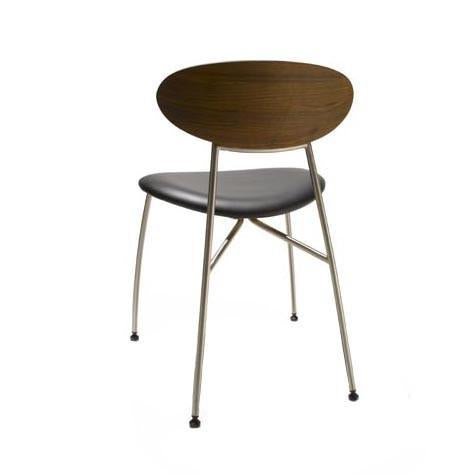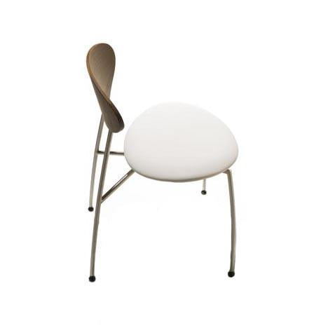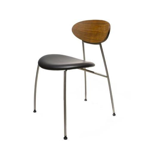 Stone chair in brushed stainless steel with an upholstered seat and wooden back. The chair features gentle curves that make it very comfortable to sit in.