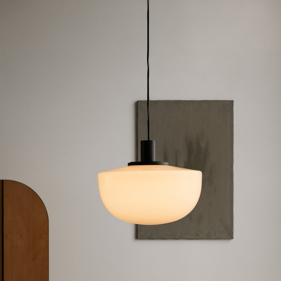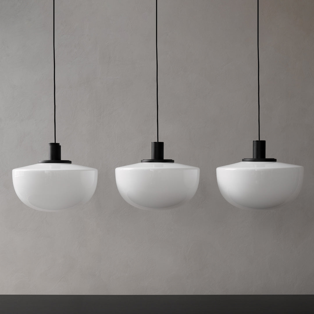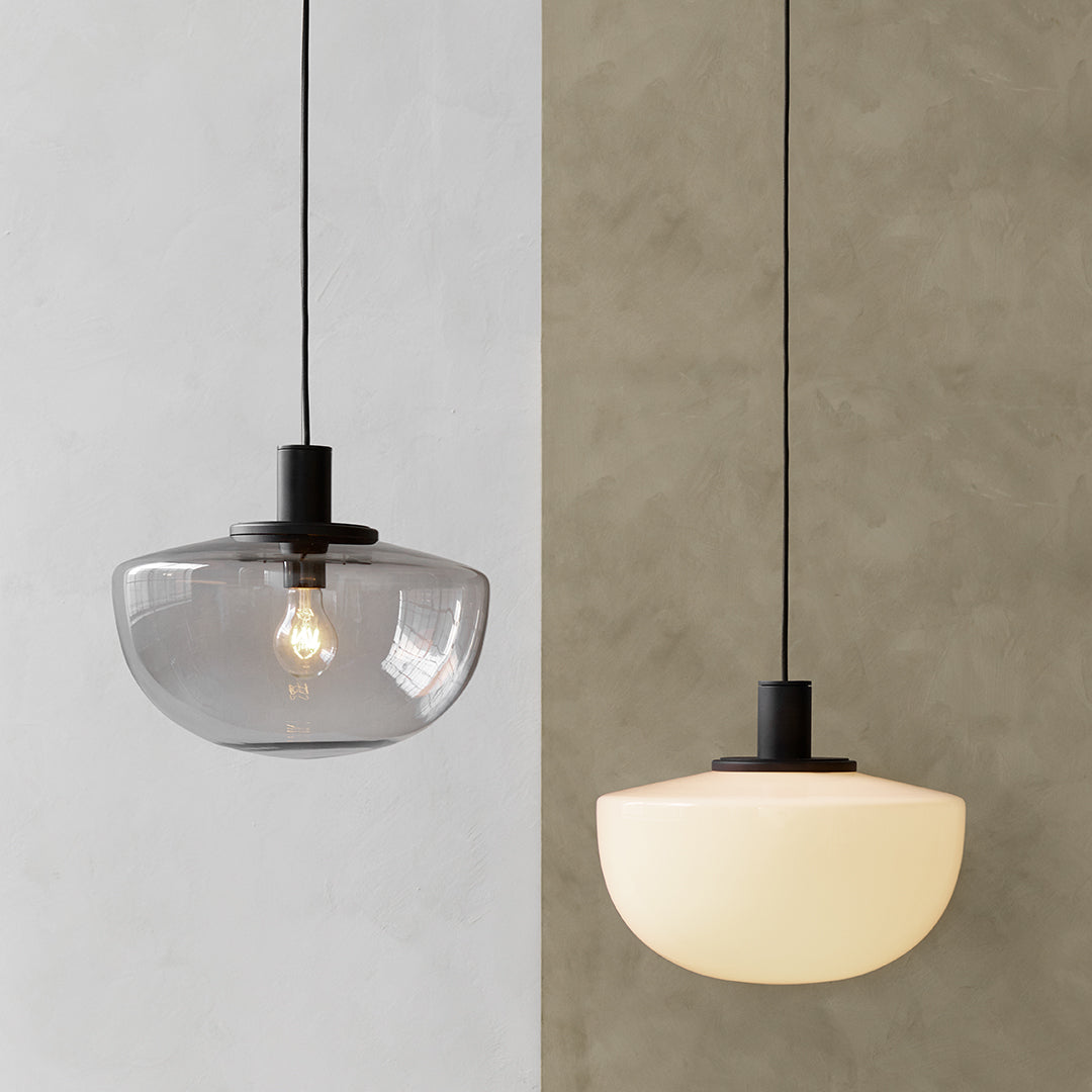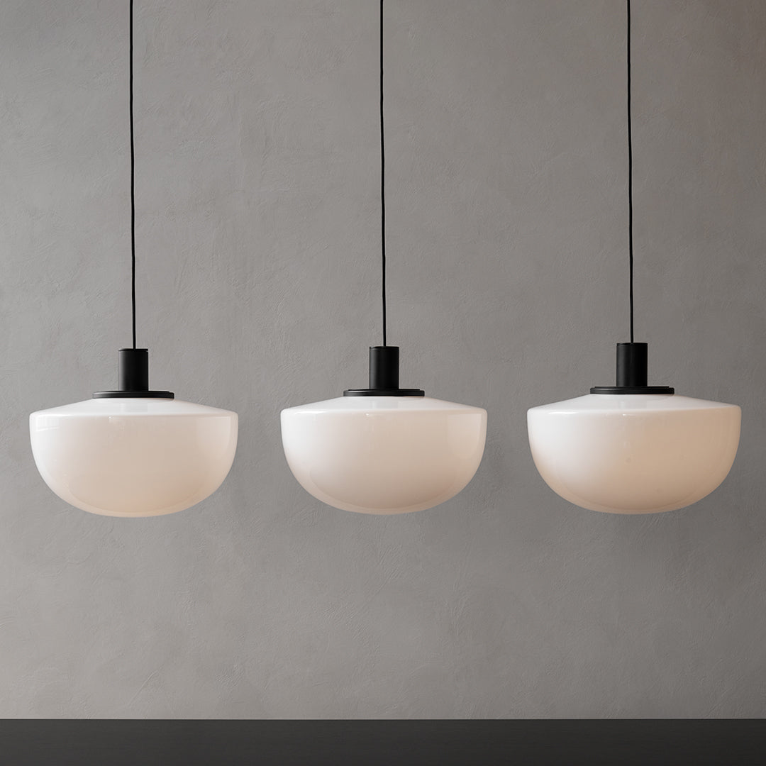 The Bank Pendant is an indoor, semicircular pendant crafted from opal or smoke mouth-blown glass and black powder-coated aluminum fittings. The opaque glass gently diffuses 360-degree light from any E26 bulb, creating ambience and providing excellent task lighting. The pairing of opaque glass and fine metal lends the product enduring quality, tactility and longevity. A special fitting with a wire ensures that the unique glass shade can easily be adjusted to hang evenly.