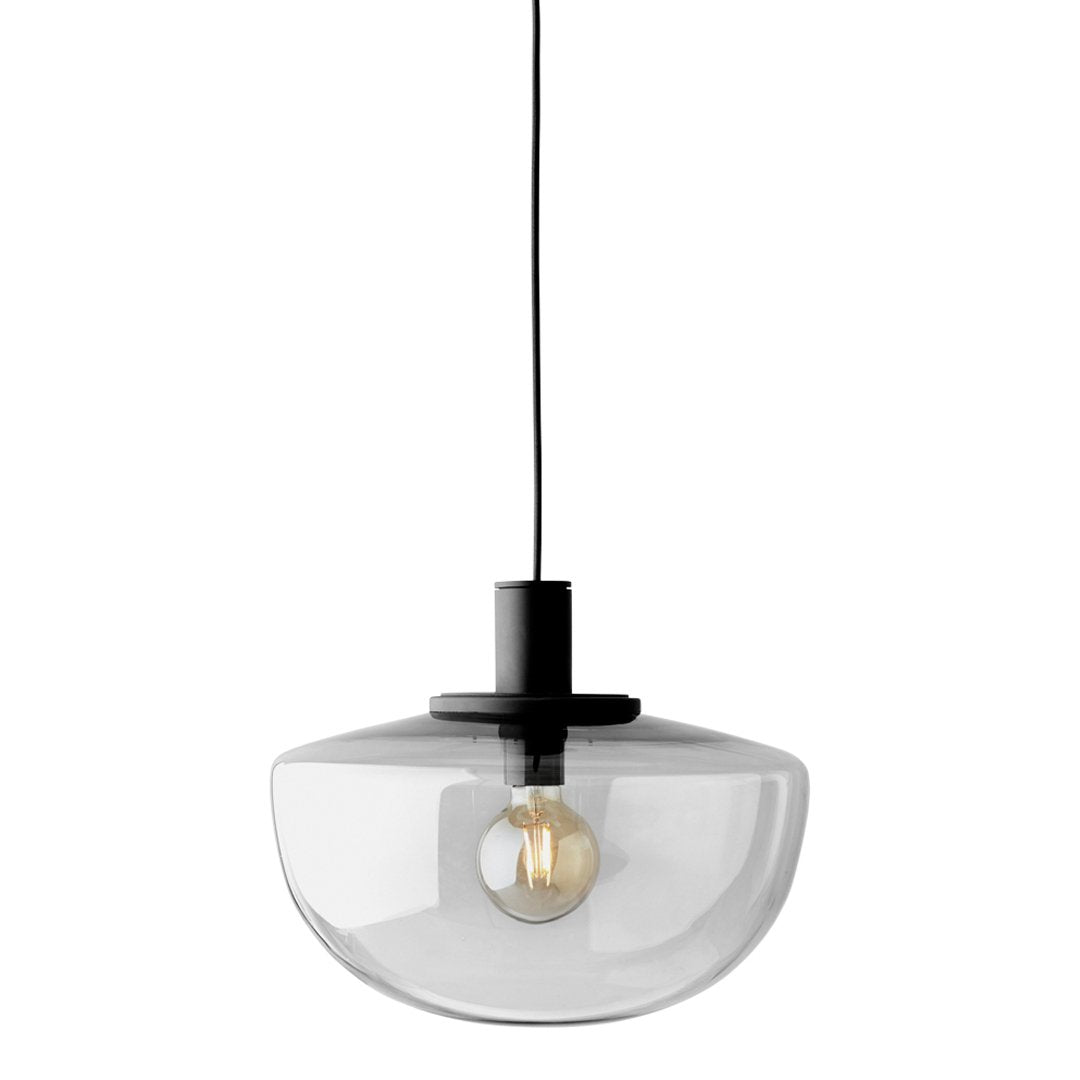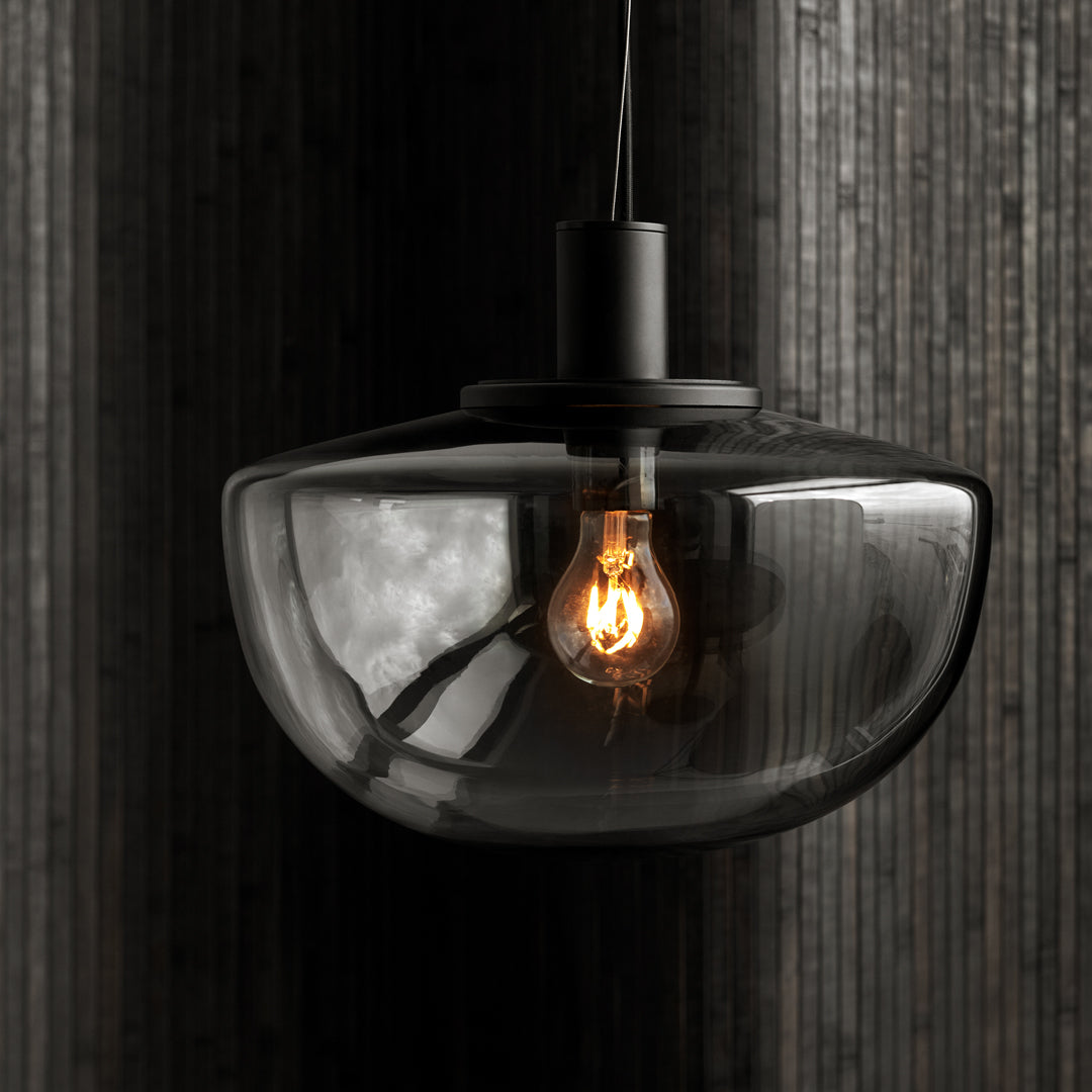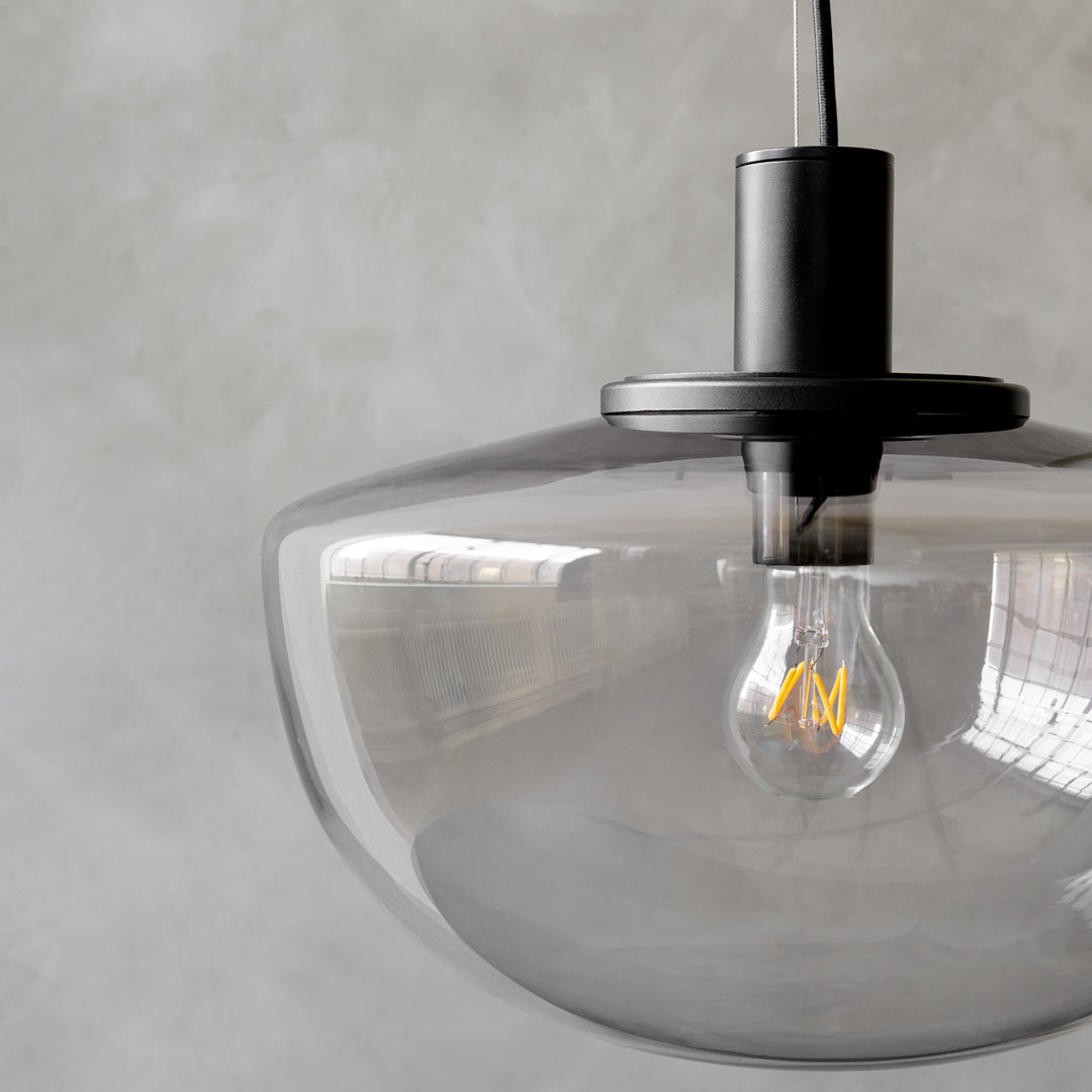 The Bank Pendant is an indoor, semicircular pendant crafted from opal or smoke mouth-blown glass and black powder-coated aluminum fittings. The opaque glass gently diffuses 360-degree light from any E26 bulb, creating ambience and providing excellent task lighting. The pairing of opaque glass and fine metal lends the product enduring quality, tactility and longevity. A special fitting with a wire ensures that the unique glass shade can easily be adjusted to hang evenly.