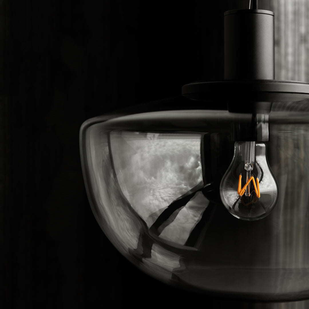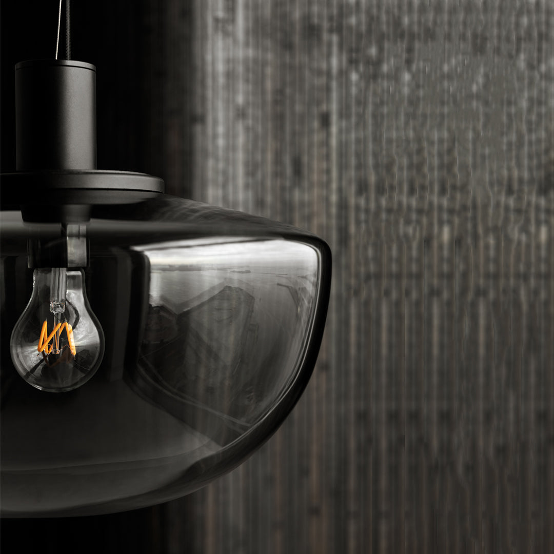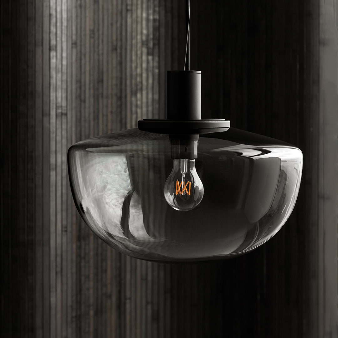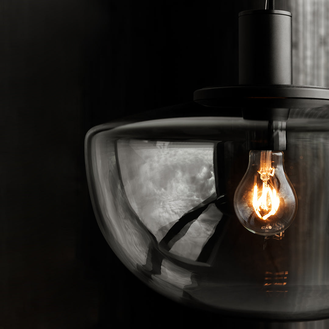 The Bank Pendant is an indoor, semicircular pendant crafted from opal or smoke mouth-blown glass and black powder-coated aluminum fittings. The opaque glass gently diffuses 360-degree light from any E26 bulb, creating ambience and providing excellent task lighting. The pairing of opaque glass and fine metal lends the product enduring quality, tactility and longevity. A special fitting with a wire ensures that the unique glass shade can easily be adjusted to hang evenly.
