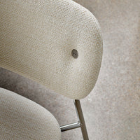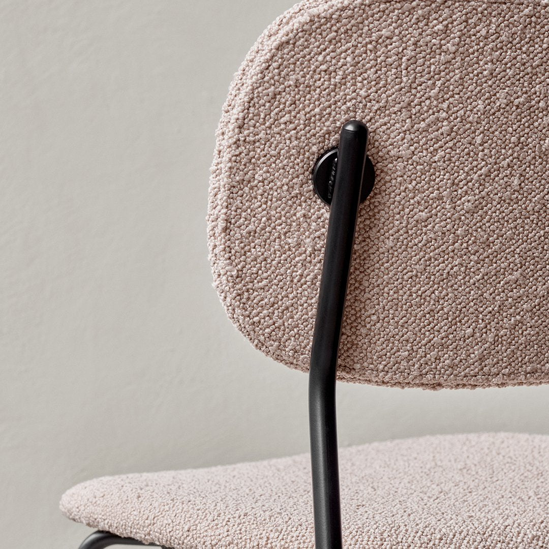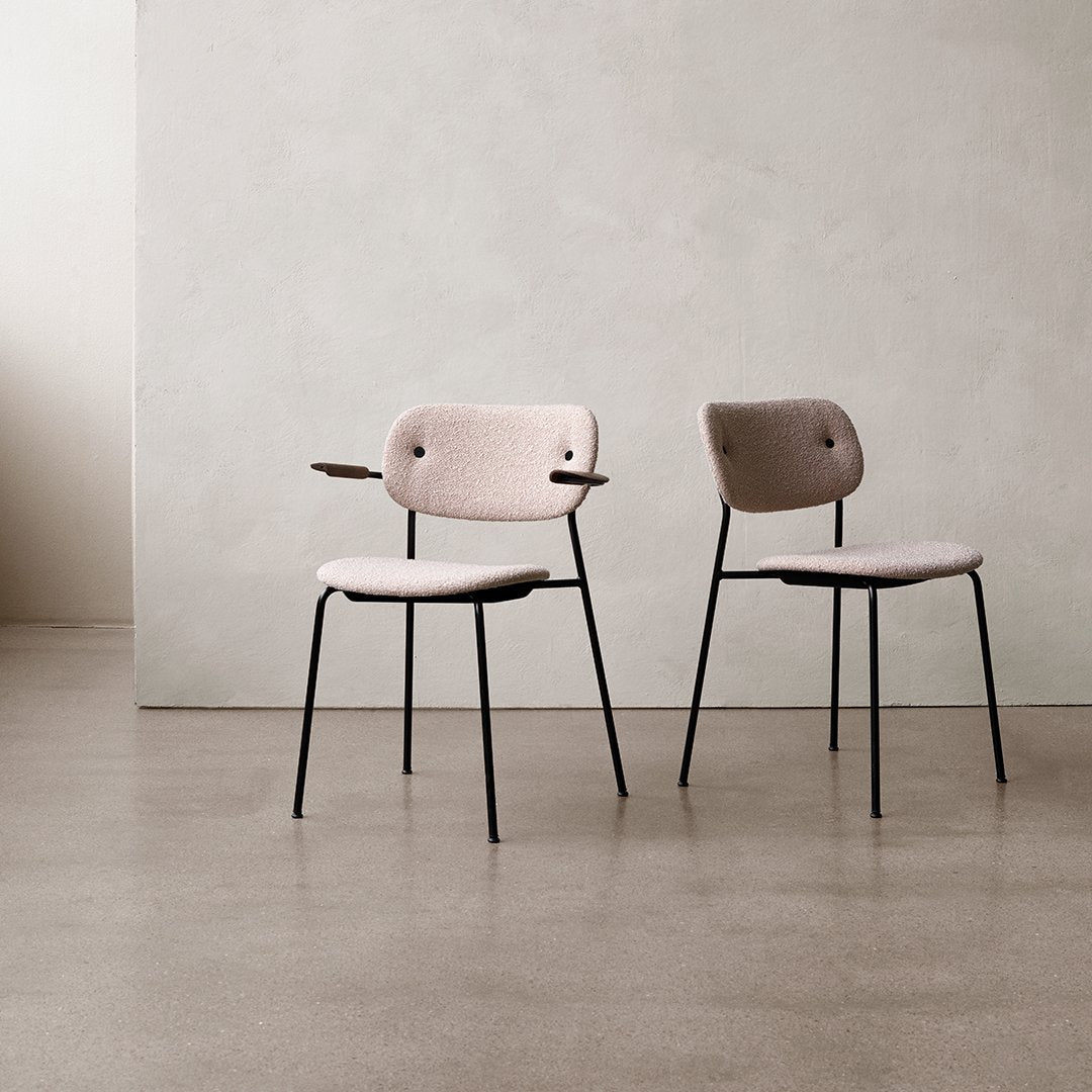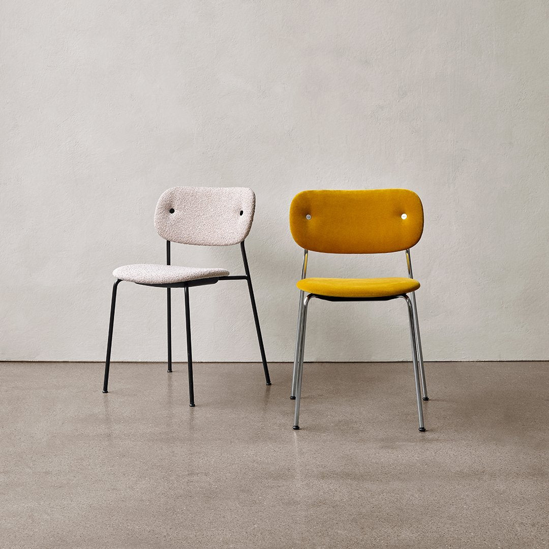 Now offered in a fully upholstered version, the Co Chair is even easier to customize to your desired expression. Perfectly proportioned for freedom of movement and sitting comfort, the wide back and generous seat are lightly padded and covered in one of a range of beautiful fabrics from our collection. The same lightweight, sleek frame remains; available in black powder coated steel or chrome and with or without armrests.