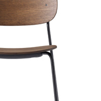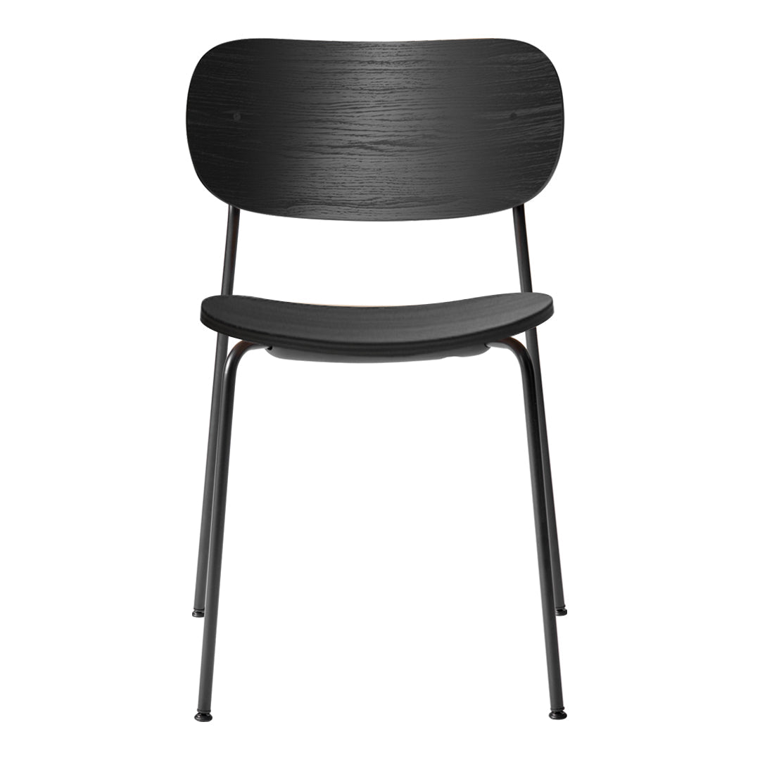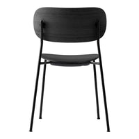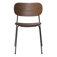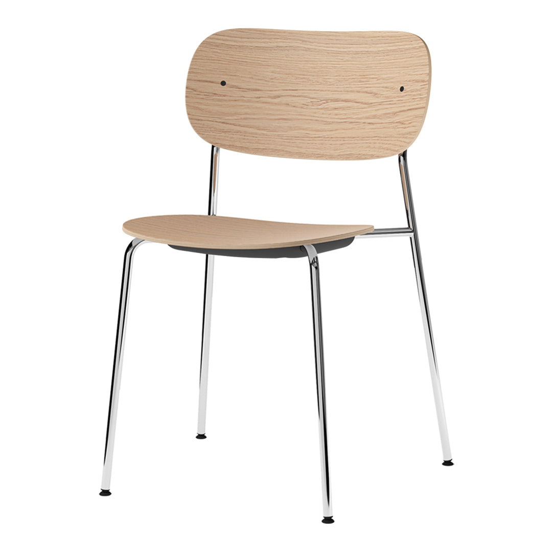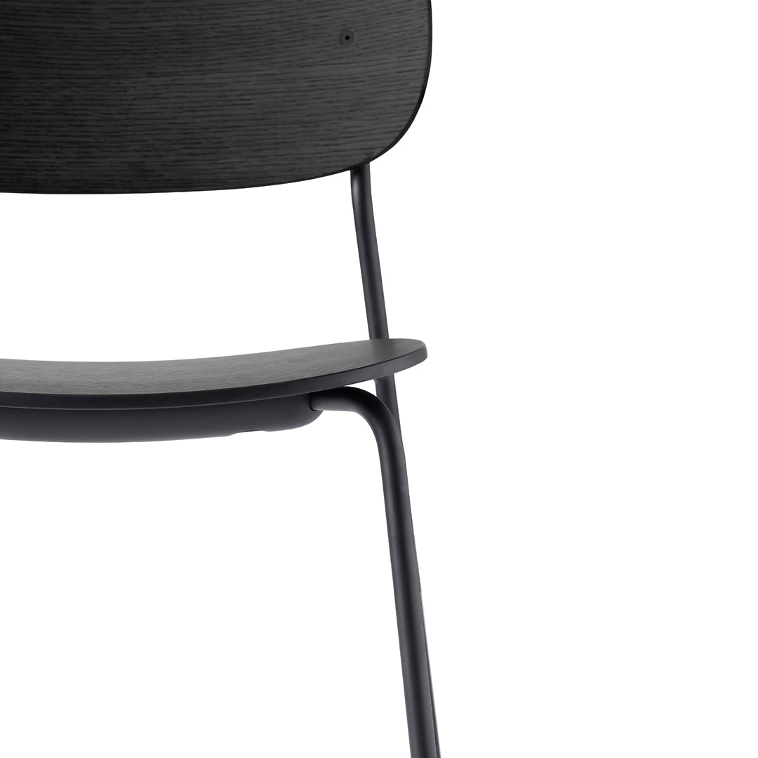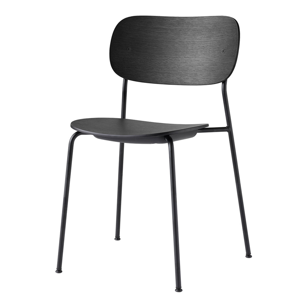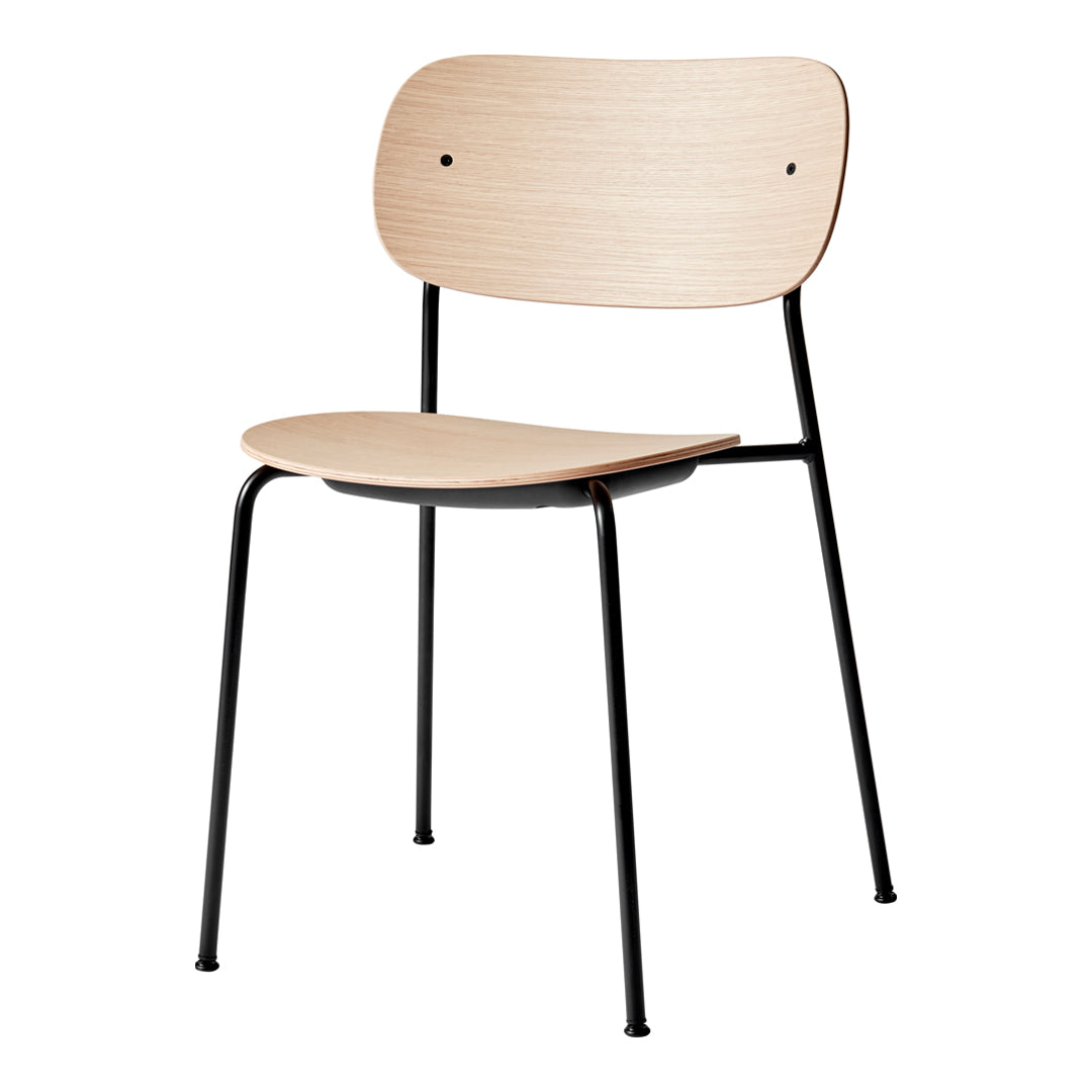 The chair is distinguished by a wide veneer back, whose proportions allow freedom of movement and provide maximum comfort. Comfort also led the design of the backrest, which is positioned and angled for exceptional support. The Co Chair's slender yet robust powder-coated steel frame defines the intriguing geometric silhouette, and delivers high durability. Optional veneer armrests adding another aesthetic and functional dimension, serving both for added comfort and for suspending the chair off the floor for easy cleaning.