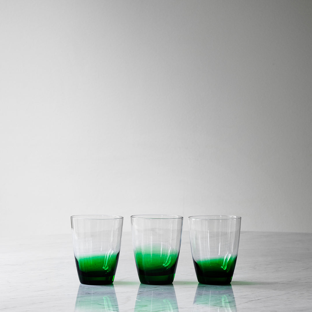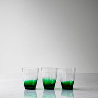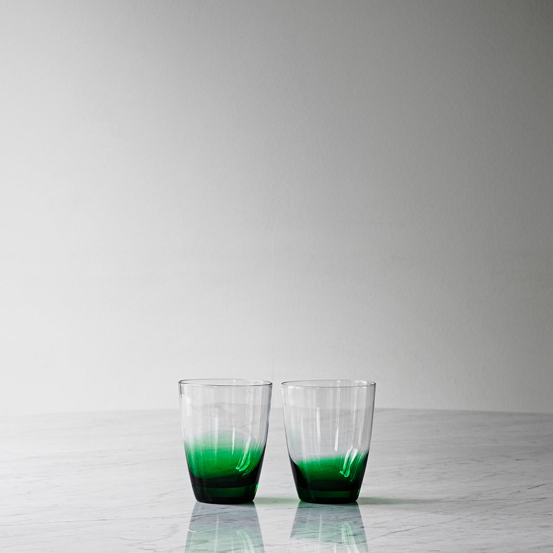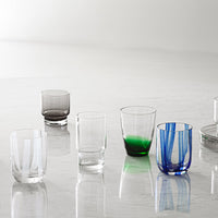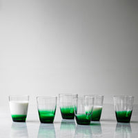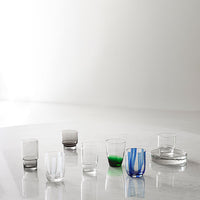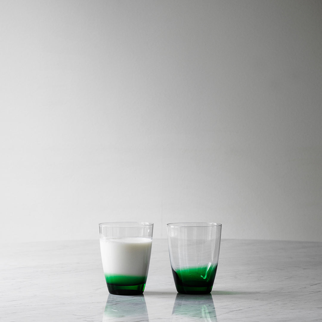 Hue, Stripe and Fit: A new series of glasses to elevate the table setting. As implied by their respective names, Hue is characterized by its touch of color, Stripe by its distinctive, hand-painted stripes, while the Fit Glasses simply fit elegantly into one another when stacked. The glasses can easily be mixed and matched for a personal, informal expression.Appearing as though they have been dipped in a rich, green dye, the Hue Glasses feature a beautiful, faded tone around the base. The glasses are characterized by their elegantly rounded shape and tinted hue, offering a depth to the otherwise light expression of the design.