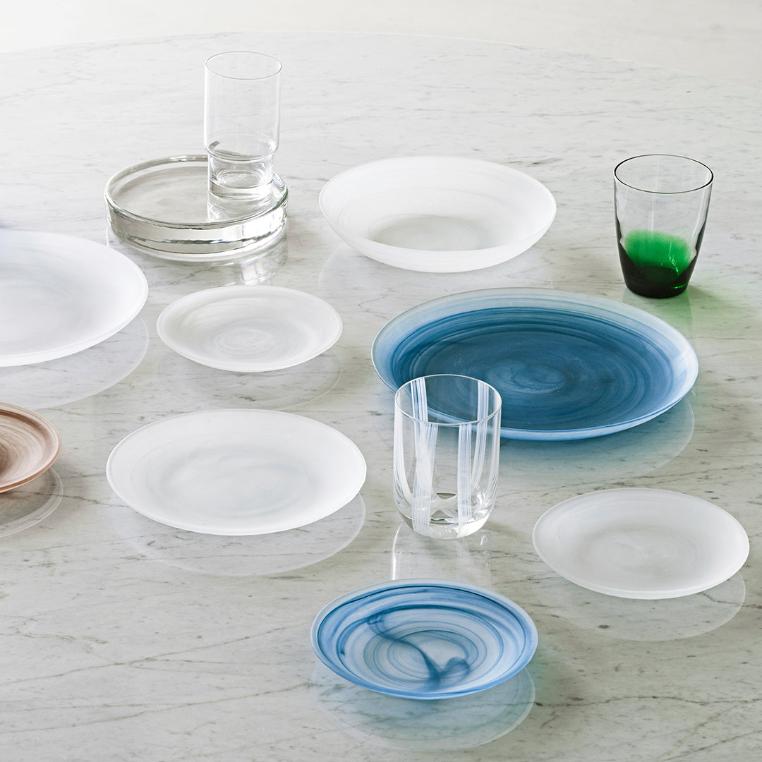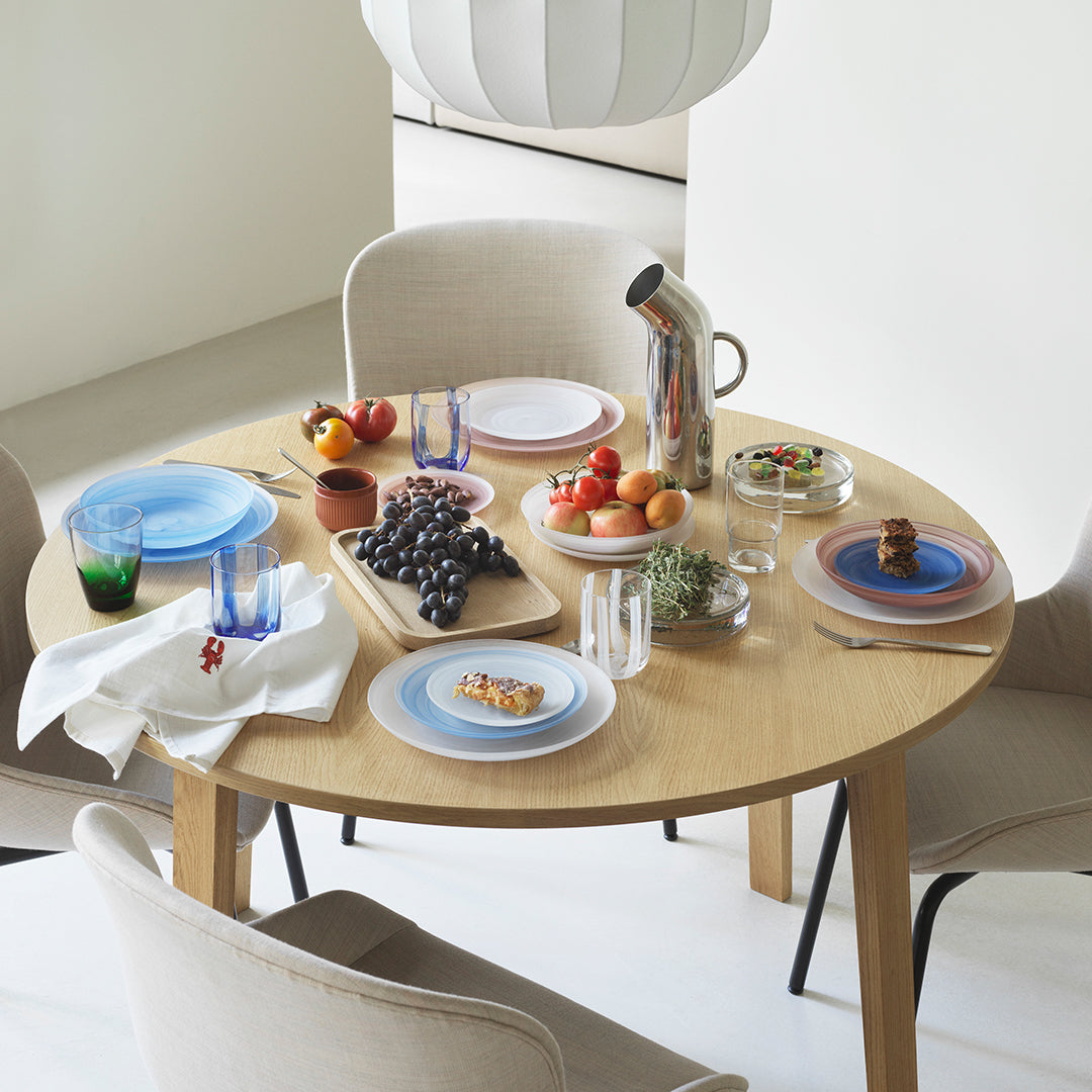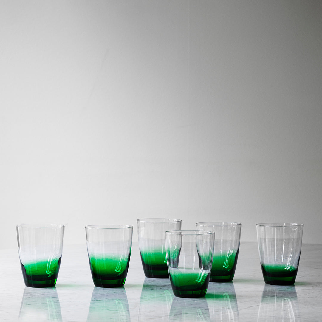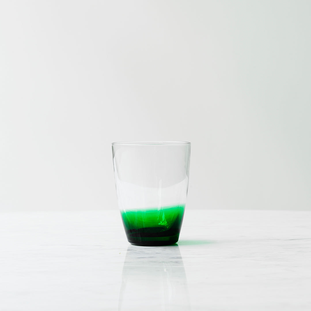 Hue, Stripe and Fit: A new series of glasses to elevate the table setting. As implied by their respective names, Hue is characterized by its touch of color, Stripe by its distinctive, hand-painted stripes, while the Fit Glasses simply fit elegantly into one another when stacked. The glasses can easily be mixed and matched for a personal, informal expression.Appearing as though they have been dipped in a rich, green dye, the Hue Glasses feature a beautiful, faded tone around the base. The glasses are characterized by their elegantly rounded shape and tinted hue, offering a depth to the otherwise light expression of the design.