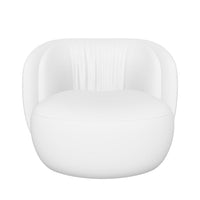 Available in two distinct sizes and base options, the Ovata offers versatility for various interior settings. The intimate small version (28.7" W × 27.6" D × 29.1" H) provides a perfectly proportioned accent chair for more compact spaces, while the generous large version (36.2" W × 31.1" D × 29.1" H) offers a more substantial presence for spacious living areas. Both sizes feature the collection's signature oval-shaped, pleated back that gently embraces the rounded seat cushion in a visual representation of comfort.