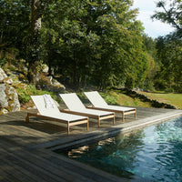 Supremely comfortable and flexible, the Pelagus sunbed looks equally as good in intimate private settings or grouped around the pool of a hotel or resort. The well-crafted wooden frame is expressive yet simple, its archetypal wooden wheels making it easy to move and follow the sun while the weatherproof Sling fabric seat brings a modern edge with its lightness and transparency. The Pelagus sunbed can be set into 5 positions, for lying down, reclining or sitting. br> br>Armrest and Cushion sold separately.