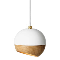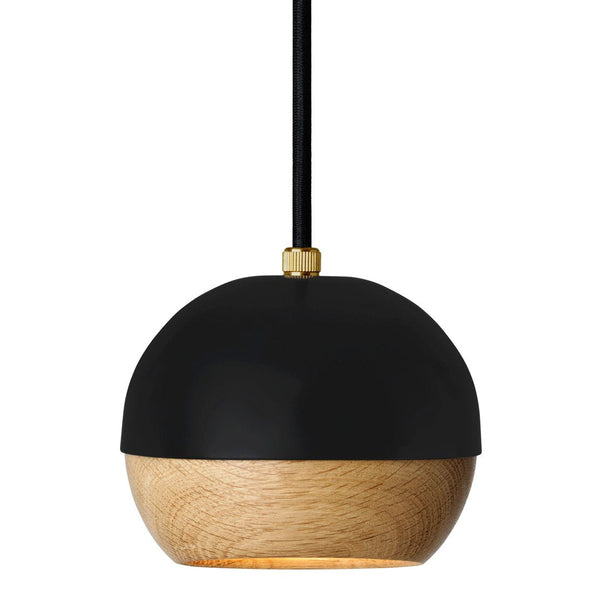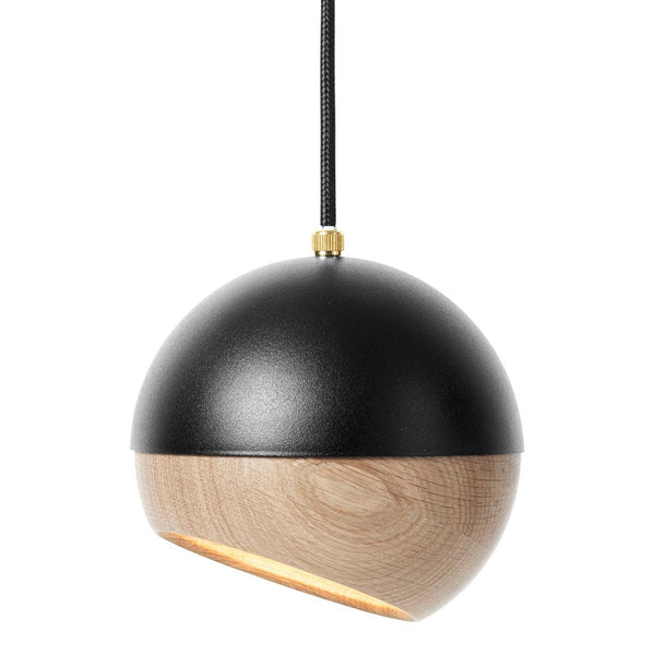 Ray’s outer shell is constructed in steel, with wooden inner globe housing, and textile-covered cord.