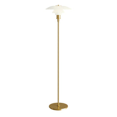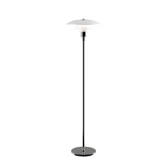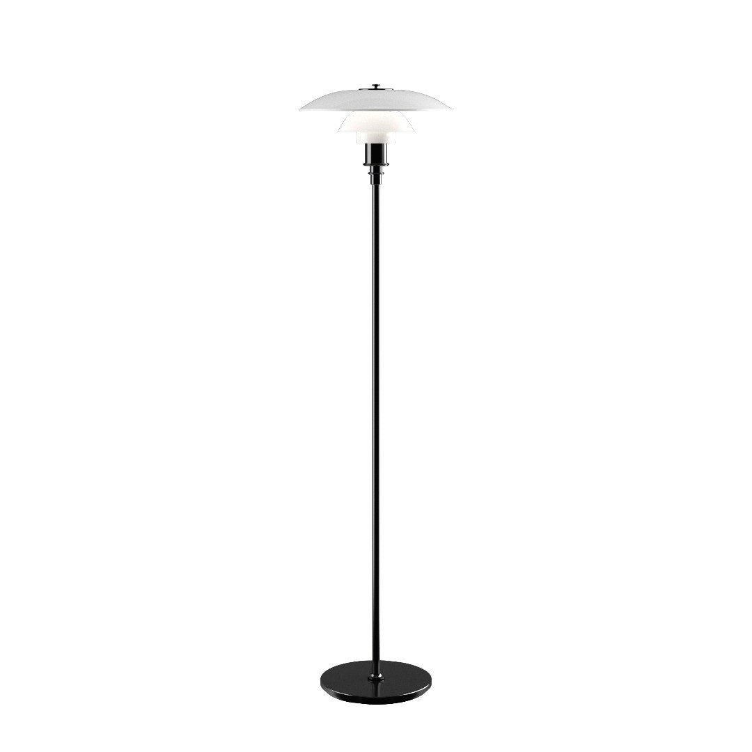Poul Henningsen designed the three-shade system during 1925/1926. The first lights using the system were designed for an exhibition in Paris. His work with Louis Poulsen continued until his death in 1967. Throughout his life, PH sought to create glare-free lighting; aiming to direct light where it was most needed, and creating soft shadows while using incandescent bulbs as a light source. The 3 ½-2 ½ Floor light is a member of the three-shade family and is one of 19 versions available today. Approximately one thousand different models have been produced over the years and consisted of table, floor and wall lamps, as well as a number of different chandeliers, which were very popular in the 30s for lighting private homes with high ceilings. There were countless combination options. The lights were available in different colors, as well as a range of sizes. The first shades were made of metal with a painted undersurface, such as white, gold or silver depending on whether diffuse, warm or cold light was desired. Glass was later introduced for the three-shade system. In addition to the downward-directed light, glass lamps illuminated the room. PH was the first person to pursue a scientific approach to light and use the logarithmic spiral as a basis. By using a design based on the logarithmic spiral he achieved even distribution of light over the entire curve of the shade. This even light distribution, together with the diffuse reflection through the glass, made it possible to control glare and shadow. Each shade reduces the amount of light equally, due to their distance from the light source. The PH light model numbers refer to the shade size. Each top shade had a corresponding set of middle and lower shades. In the pure models, such as the 2/2, the top shade has a size of about 20 cm, with corresponding lower shades. PH 3 ½-2 ½ Floor consists of an approximately 35 cm top shade with lower shades. These hybrid models were introduced due to the desire to hang pendants at lower heights. The system was also used for floor, table and wall lamps. PH 3 ½-2 ½ Floor in its current form was introduced in 2002.