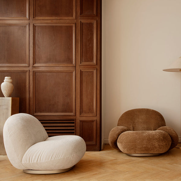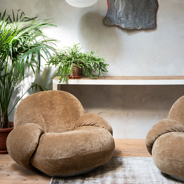 Part of GUBI's thoughtfully reissued Pacha Collection, this armrest version can be customized in an extensive array of fabrics and materials. The distinctive silhouette confidently carries bold colors and tactile expressions, allowing for personalization while maintaining the design's iconic character. When upholstered in premium materials like velvet or leather, the chair develops intentional wrinkles along its curved seams—a characteristic that adds to its sensual, lived-in appeal.