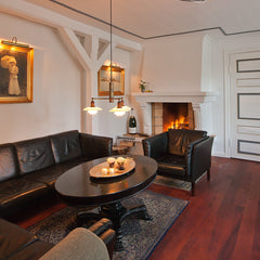The fixture is designed based on the principle of a reflective three-shade system, which directs the majority of the light downwards. The shades are made of mouth-blown opal three-layer glass, which is glossy on the top and sandblasted matt on the underside, giving a soft and diffused light distribution.