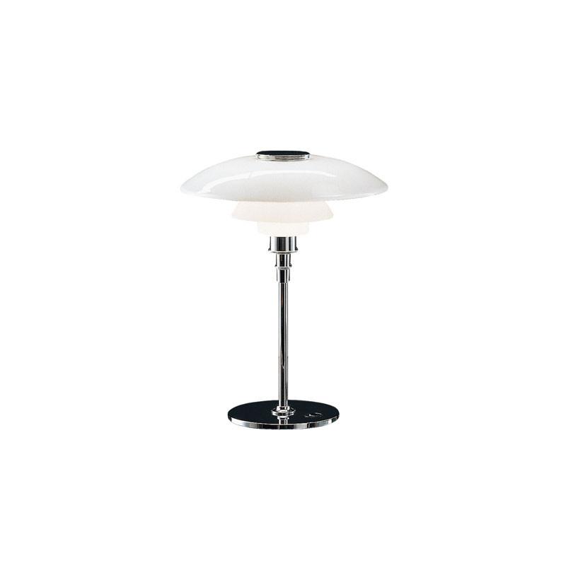 Poul Henningsen designed the three-shade system during 1925/1926. The first lights using the system were designed for an exhibition in Paris. His work with Louis Poulsen continued until his death in 1967. Throughout his life, PH sought to create glare-free lighting; aiming to direct light where it was most needed, and creating soft shadows while using incandescent bulbs as a light source. PH 4 ½-3 ½ Glass Table is a member of the three-shade family and is one of 19 versions available today. Approximately one thousand different models have been produced over the years and consisted of table, floor and wall lamps, as well as a number of different chandeliers, which were popular in the 30s for lighting private homes with high ceilings. There were countless combination options. The lights were available in different colors, as well as a range of sizes. The first shades were made of metal with a painted undersurface, such as white, gold or silver depending on whether diffuse, warm or cold light was desired. Glass was later introduced for the three-shade system. In addition to the downward-directed light, glass lamps illuminated the room. PH was the first person to pursue a scientific approach to light and use the logarithmic spiral as a basis. By using a design based on the logarithmic spiral he achieved even distribution of light over the entire curve of the shade. This even light distribution, together with the diffuse reflection through the glass, made it possible to control glare and shadow. Each shade reduces the amount of light equally, due to their distance from the light source. The PH light model numbers refer to the shade size. Each top shade had a corresponding set of middle and lower shades. In the pure models, such as the 2/2, the top shade has a size of about 20 cm, with corresponding lower shades. PH 4 ½-3 ½ Glass Table consists of an approximately 45 cm top shade, but uses lower shades from the 3 ½ model. These hybrid models were introduced due to the desire to hang pendants at lower heights. The system was also used for wall, table and floor lamps. PH 4 ½-3 ½ Glass Table in its current form was introduced in 1990.