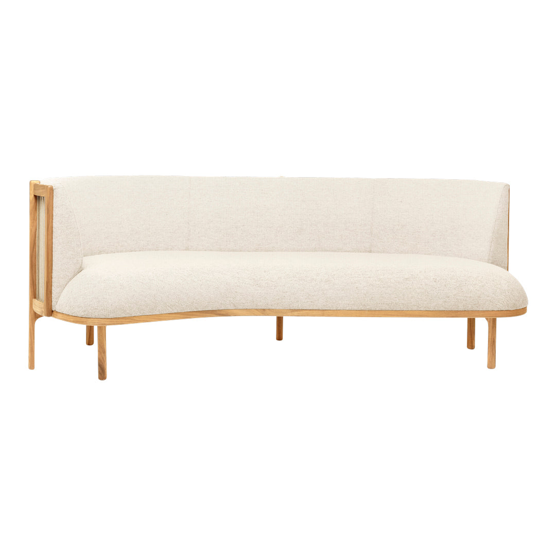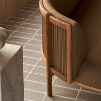 The Sideways Sofa from Rikke Frost combines classic materials – wood, paper cord, and high-quality upholstery textile – with a modern asymmetric shape. The steam-bent backrest is shaped from solid wood and woven paper cord for a light, elegant expression, while the seat and back are padded and upholstered for optimal comfort. The result is a sofa you want to sit in for a long time.